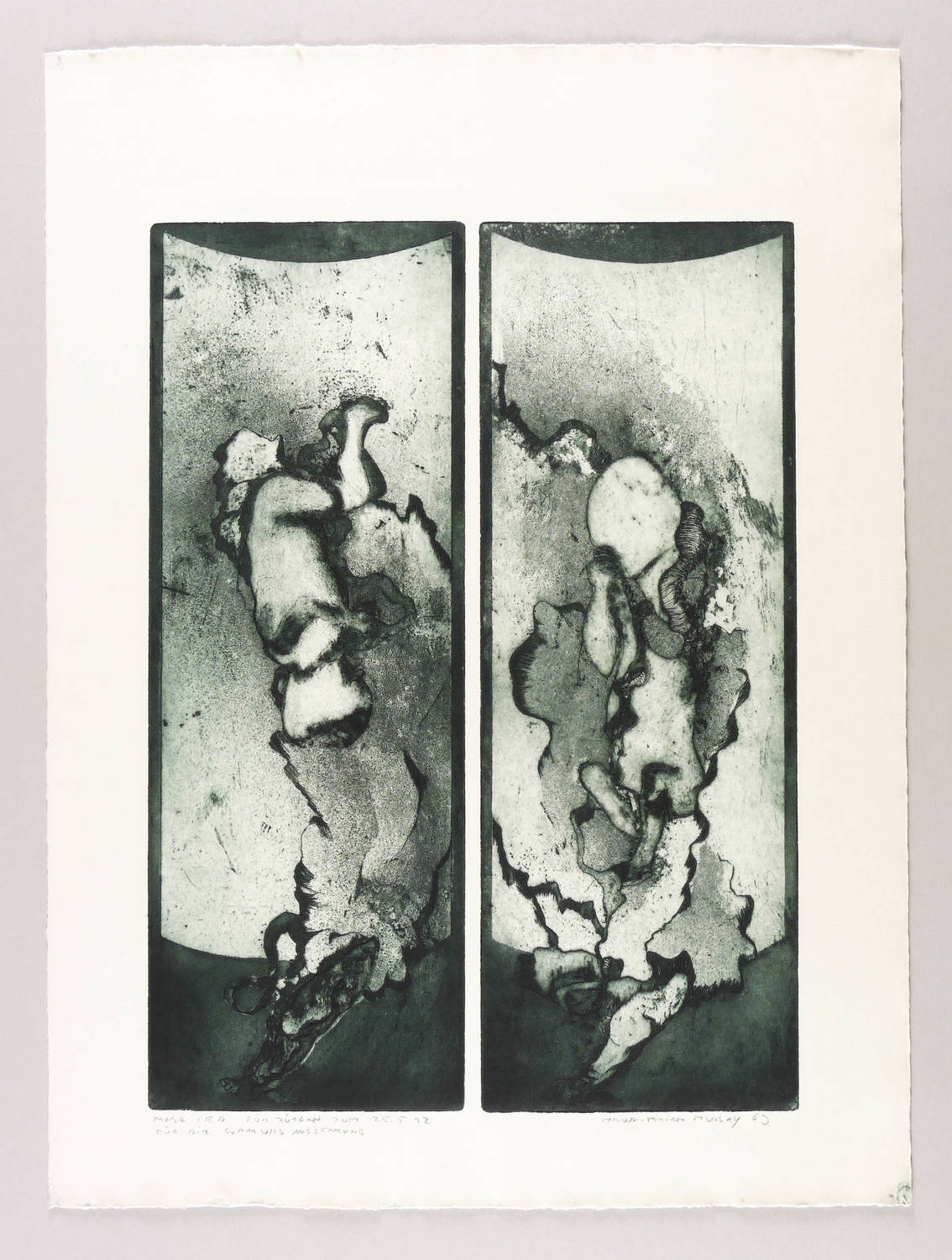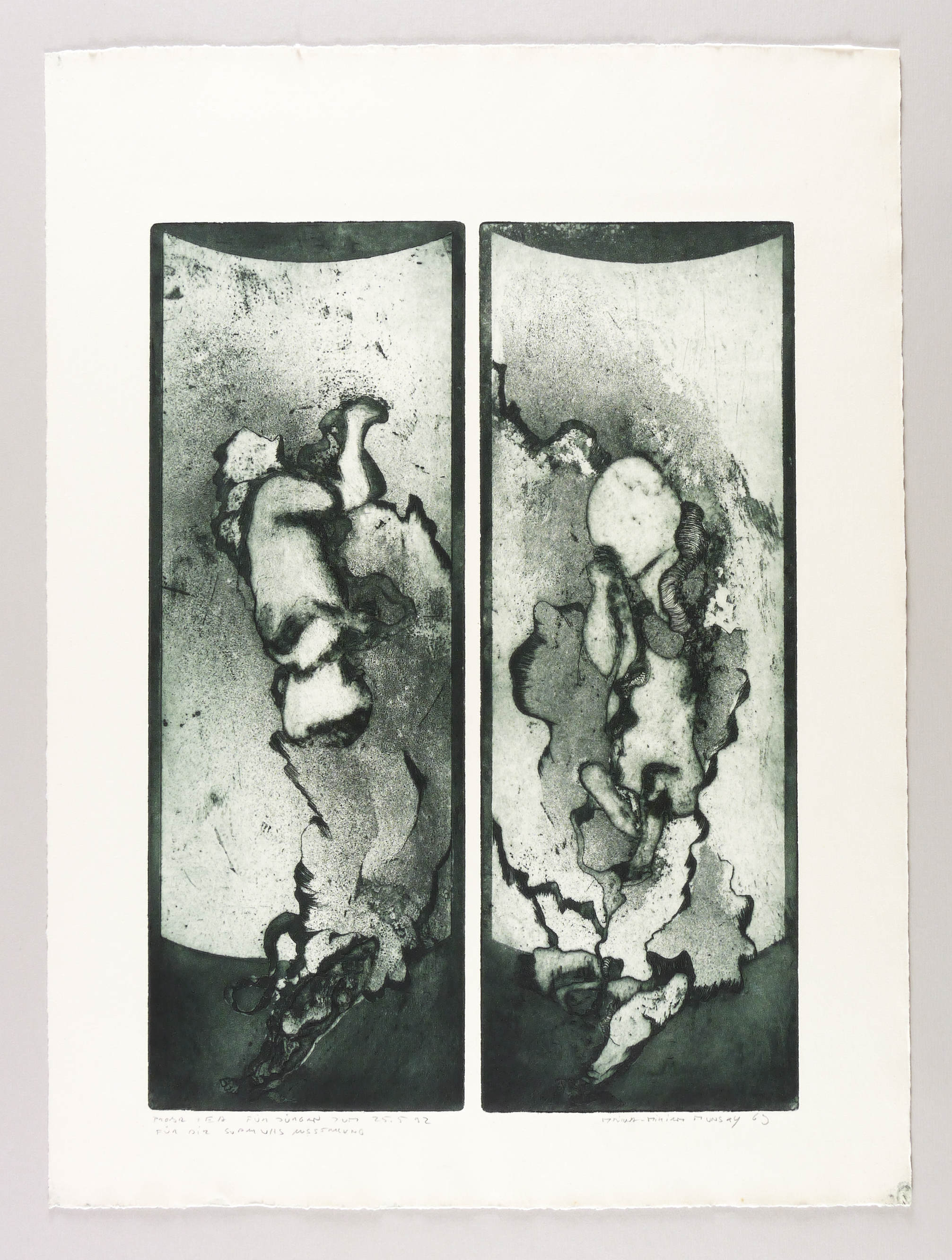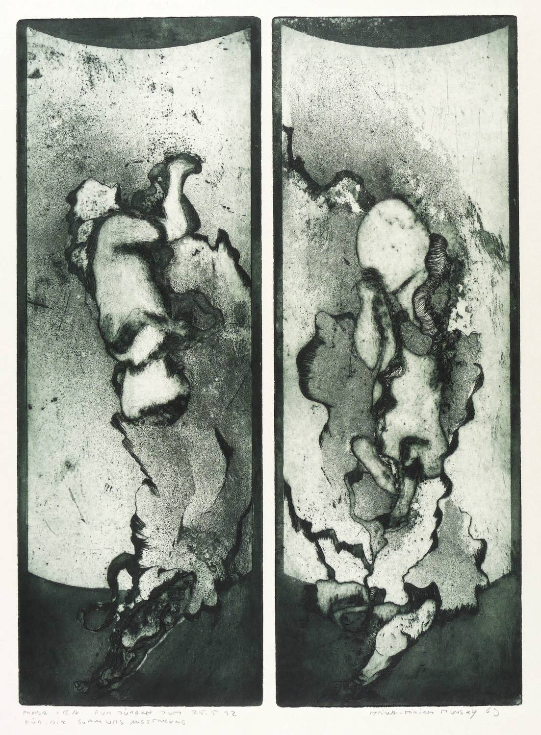 1969. Radierung / Aquatinta & Strichätzung, von 2 Platten, in Schwarzblau, auf gelbem Büttenkarton. – Originale Künstlergrafik, von Maina-Miriam Munsky. – Probedruck. – 49,8 x 17,8 cm (Darstellungen), 66 x 49 cm (Blatt).
