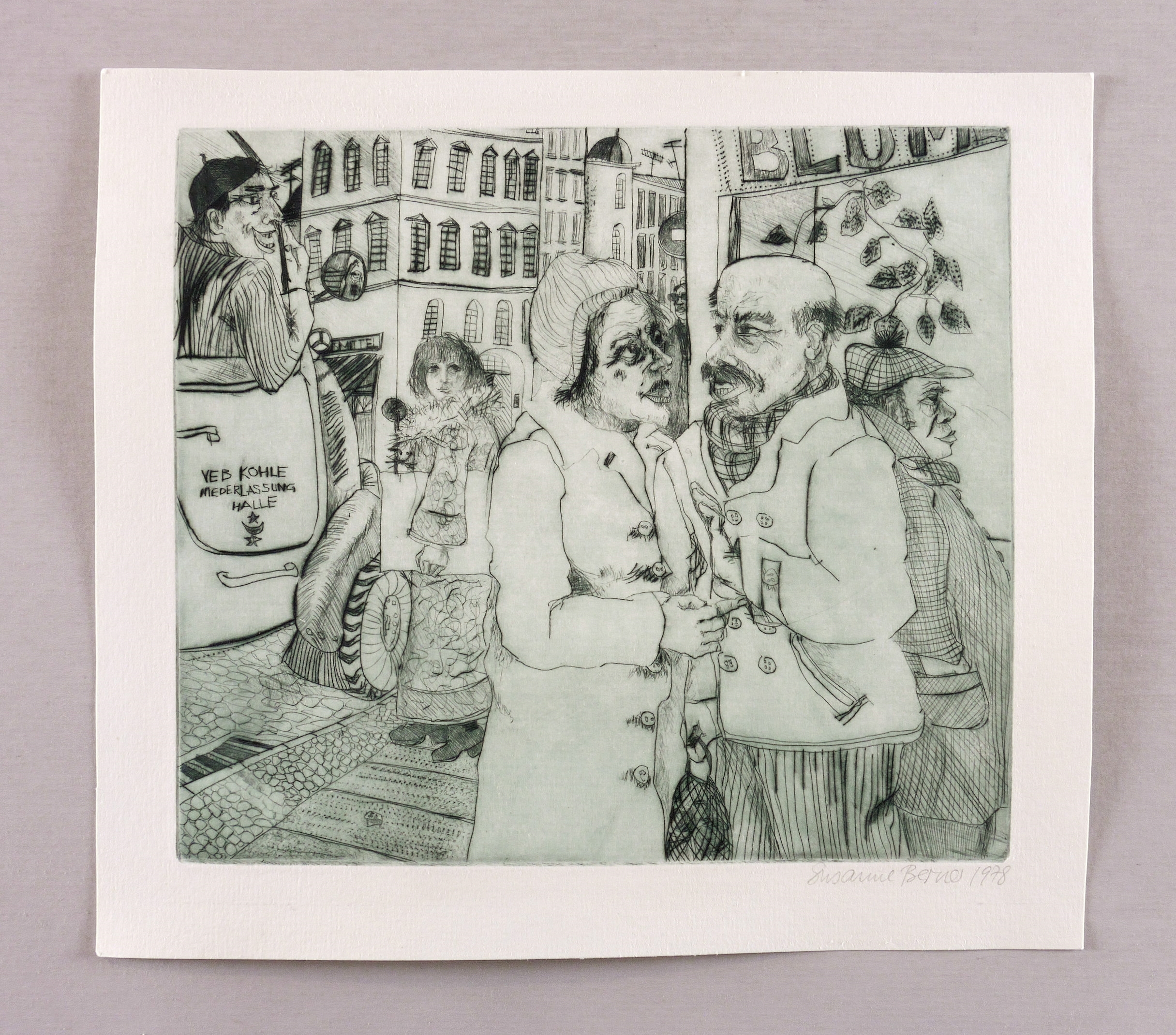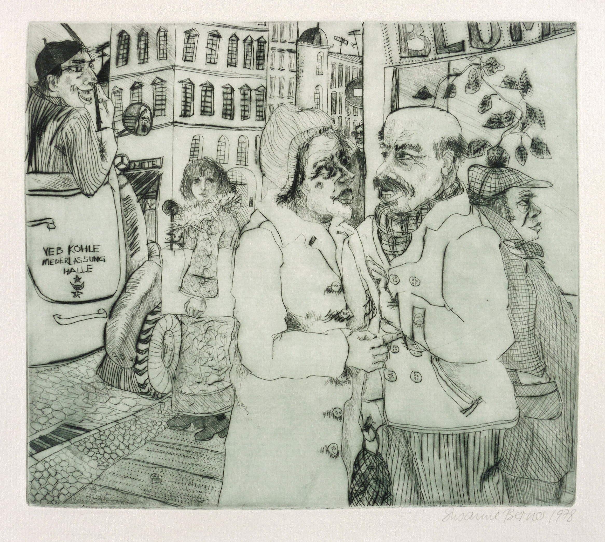 1978. Radierung / Kaltnadel, in Schwarzblau, auf hellchamois Weißenborn. – Originale Künstlergrafik, von Susanne Berner. – 18,9 x 21,3 cm (Darstellung / Platte), 23 x 26 cm (Blatt).