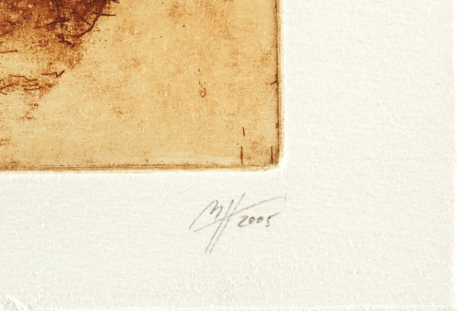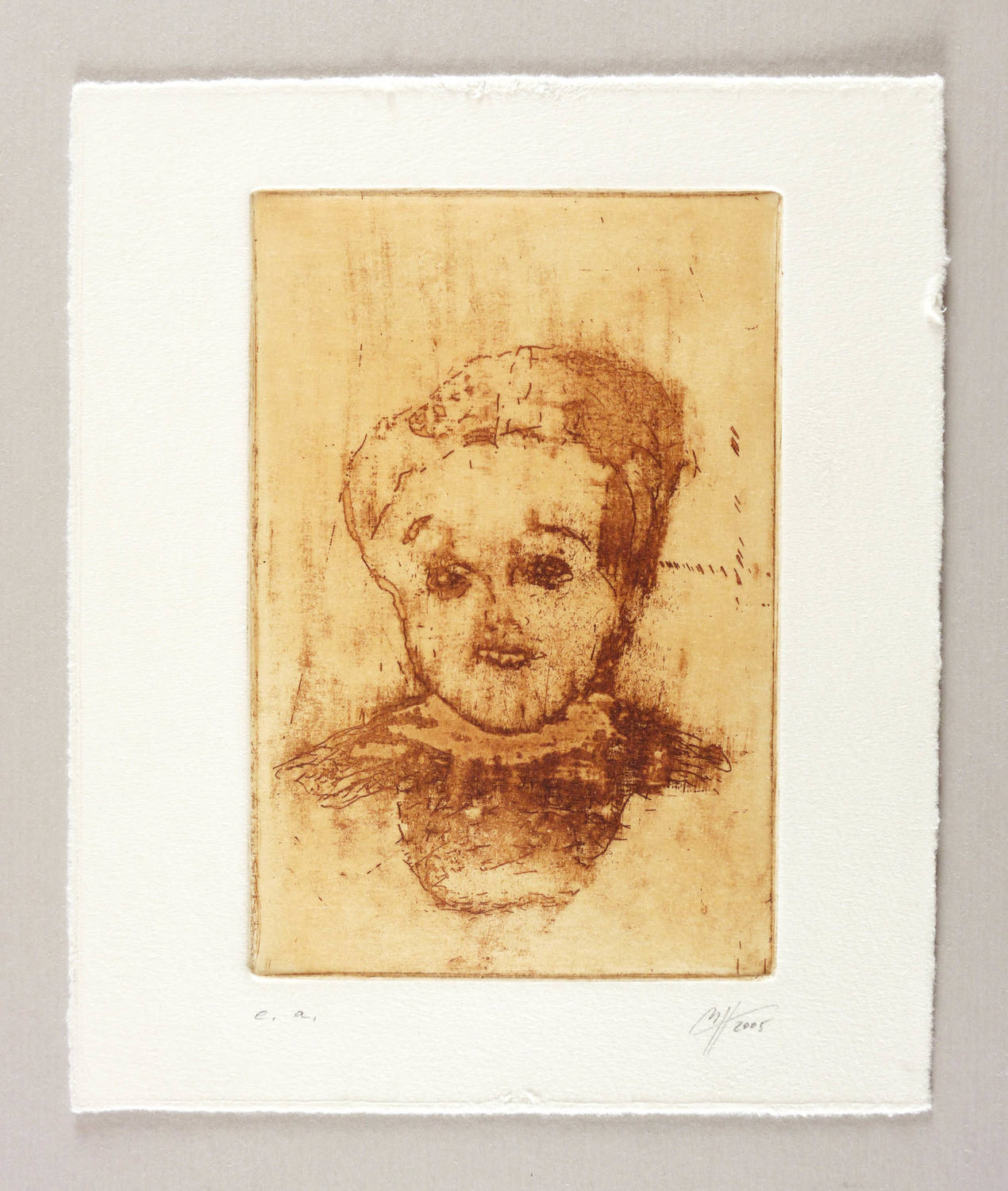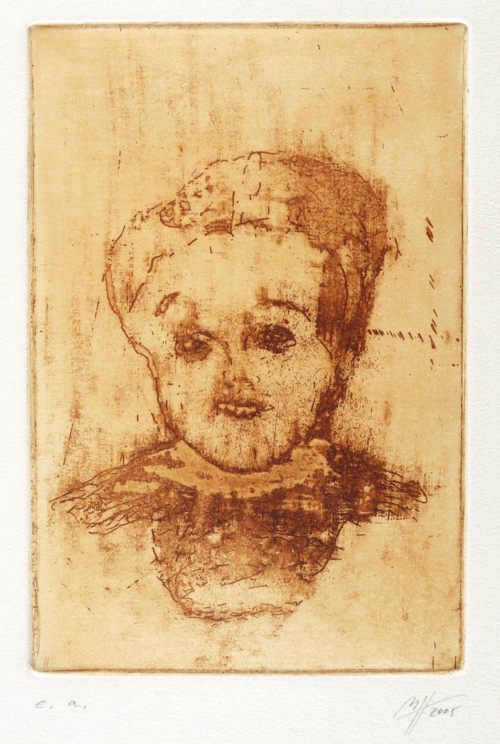 2005. Radierung / Vernis mou & Kaltnadel, partiell geschliffen, in Sepia, auf hellchamois Velin. – Von Madeleine Heublein. – Künstlerexemplar (e.a.). – 14,8 x 9,9 cm (Darstellung / Platte), 19 x 16 cm (Blatt).