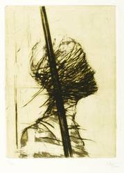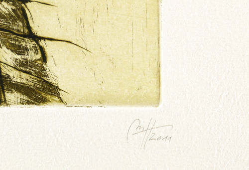 2011. Radierung / Aquatinta & Kaltnadel, geschabt, in Schwarzgrün, mit Plattenton, auf chamois Velin. – Von Madeleine Heublein. – Auflage Exemplar Nr. 5/30. – 17,8 x 12,9 cm (Darstellung / Platte), 26 x 20 cm (Blatt).