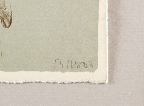 1977. Farblithografie / Kreide- & Pinsellithografie, in 3 Farben, auf chamois Velinkarton. – Von Reiner Schwarz. – Künstlerexemplar (e.a.). – 29,6 x 21,0 cm (Darstellung / Blatt).