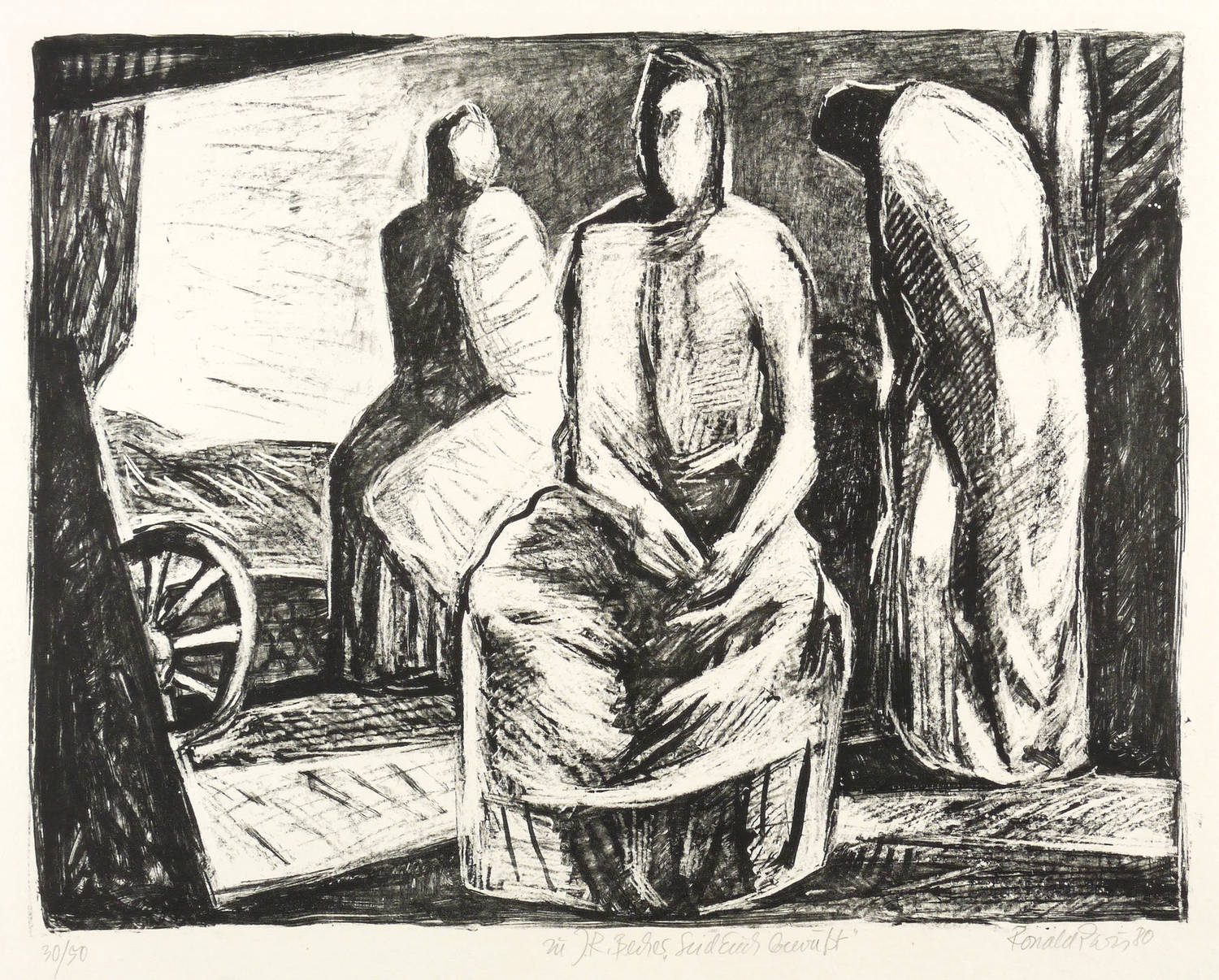 1980. Lithografie / Kreidelithografie, in Schwarz, auf glattem hellchamois Velinkarton. – Originale Künstlergrafik, von Ronald Paris. – Auflage Exemplar Nr. 30/50. – 35,3 x 45,6 cm (Darstellung / Druckbild), 42 x 60 cm (Blatt).