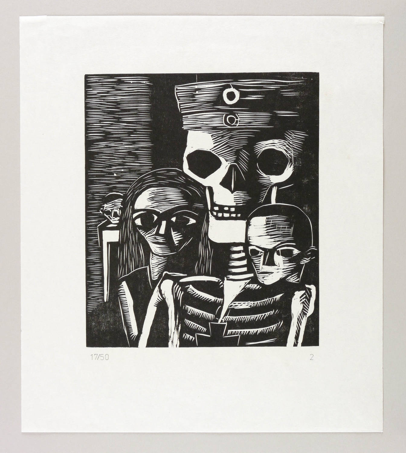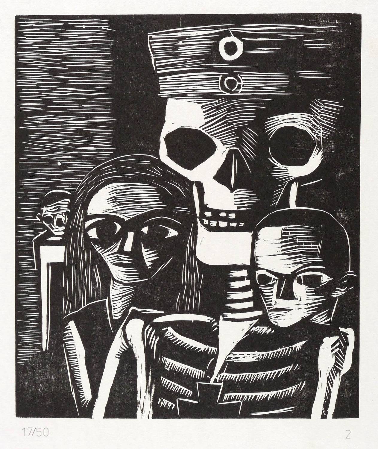 Aus: Karl Völker, Zum 100. Geburtstag. 8 Holzschnitte (Halle / Saale: Staatliche Galerie Moritzburg 1989). – Nicht handsigniert. Unterhalb typografisch nummeriert und mit Auflagenbezeichnung versehen. Verso Nachlass-Stempel und Signatur von Horst Völker. – Posthumer Abzug für die Edition der Holzschnitte, die in den 1920er Jahren für die kommunistischen Wochenzeitungen ″Das Wort″ und ″Der Klassenkampf″ entstanden, jedoch nie als Einzelblätter gedruckt worden waren (1. Fünf Jahre Sowjetmacht 1922, 2. Der Urlauber aus dem Massengrab. Das Vaterland läßt seine Familie verhungern 1924, 3. Der Gefangene I, 1924 4. Niedners Klassenjustiz 1924, 5. Der Krieg 1924, 6. Die junge Sowjetmacht 1924, 7. Rotes Weihnachten 1925, 8. Die Krone (Das Erbe der Fürsten) 1926). – Im oberen Rand rückseitig Montagereste. Sehr guter Zustand.