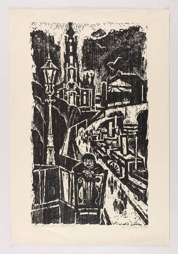1981. Holzschnitt, in Schwarz, auf hellgrauem Büttenpapier. – Originale Künstlergrafik, von Horst Jockusch. – 57,3 x 33,8 cm (Darstellung / Druckstock), 67 x 45 cm (Blatt).