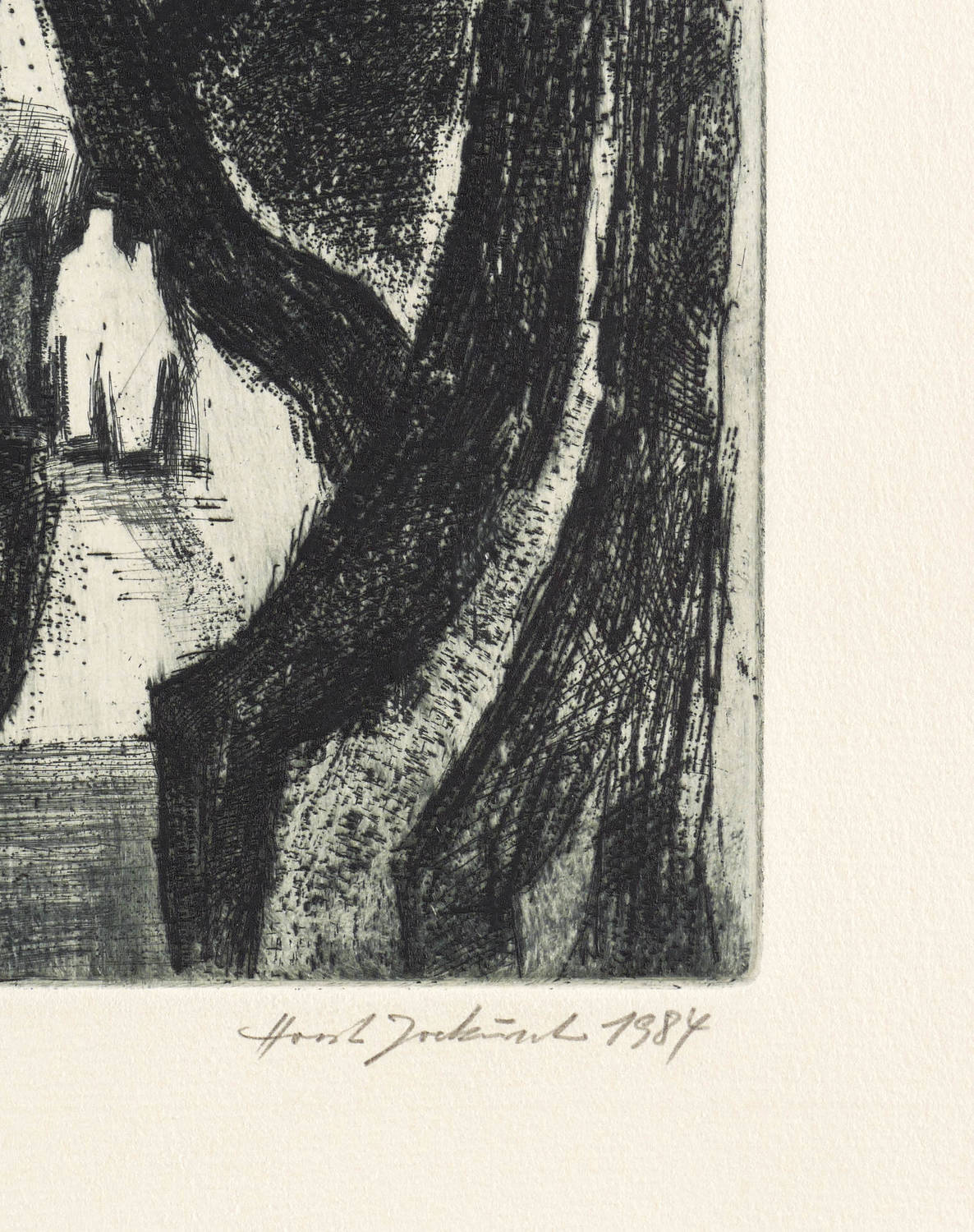 1984. Radierung / Strichätzung & Kaltnadel, in Schwarzblau, auf schwerem gelbem Velin. – Originale Künstlergrafik, von Horst Jockusch. – 53,8 x 38,4 cm (Darstellung / Platte), 61 x 46 cm (Blatt).
