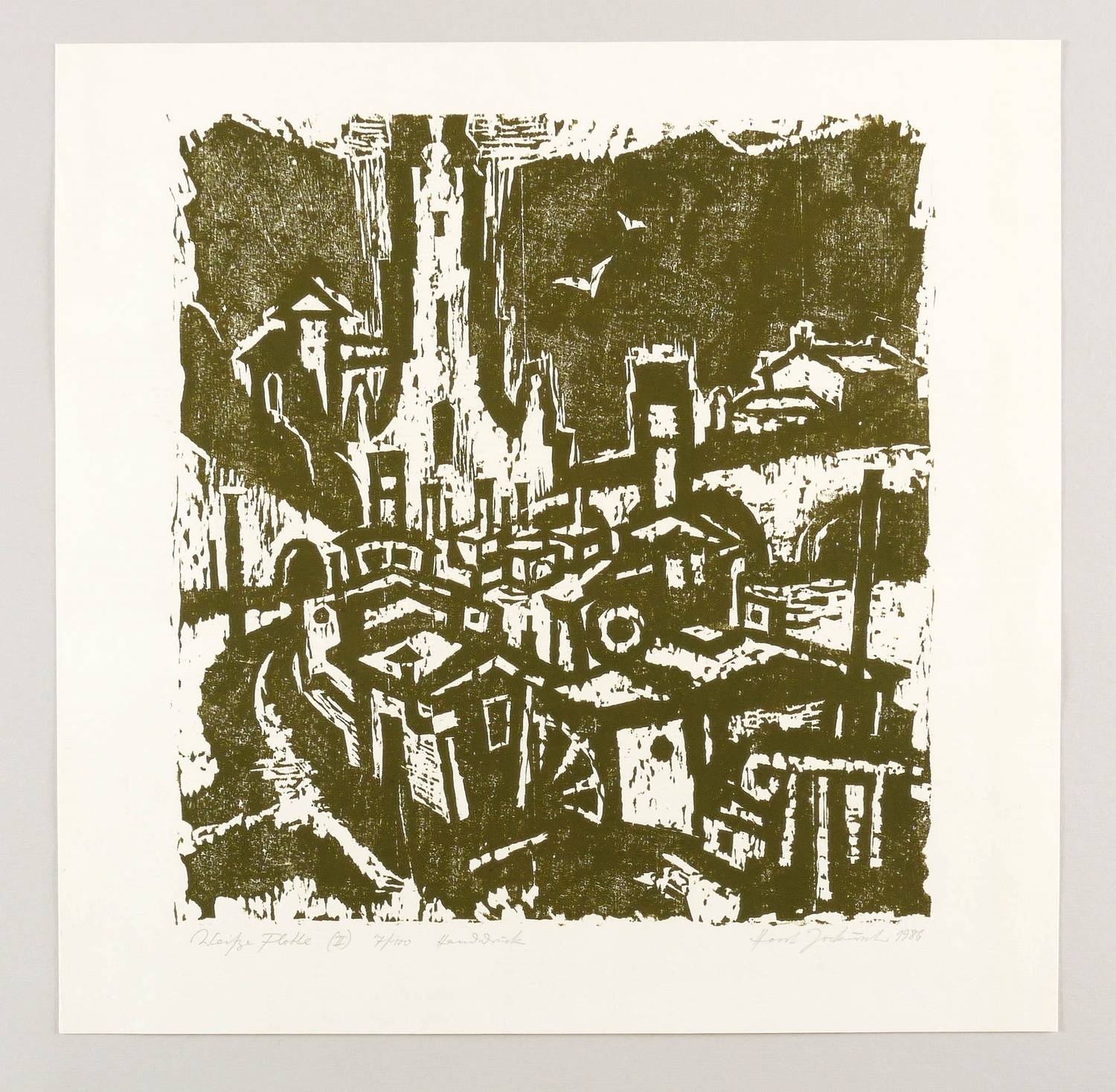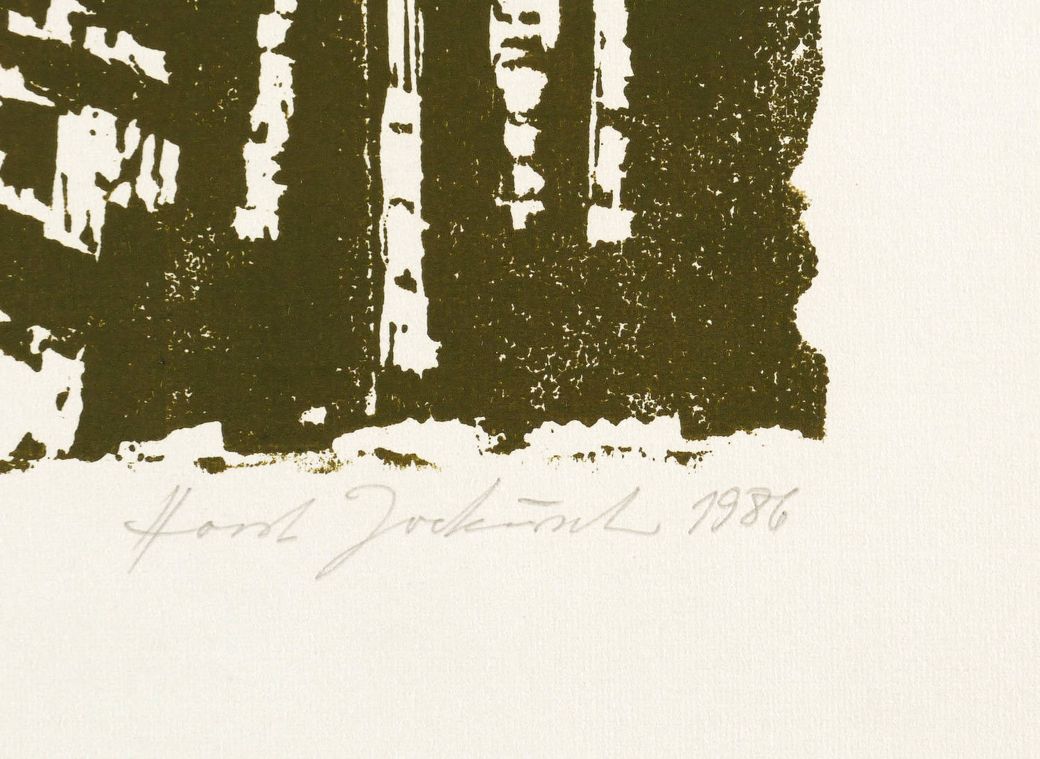 1986. Holzschnitt, in Schwarzgrün, auf festem hellgelbem Maschinenbütten. – Originale Künstlergrafik, von Horst Jockusch. – Auflage Exemplar Nr. 7/100. – 37,7 x 35,1 cm (Darstellung / Druckstock), 47 x 47 cm (Blatt).