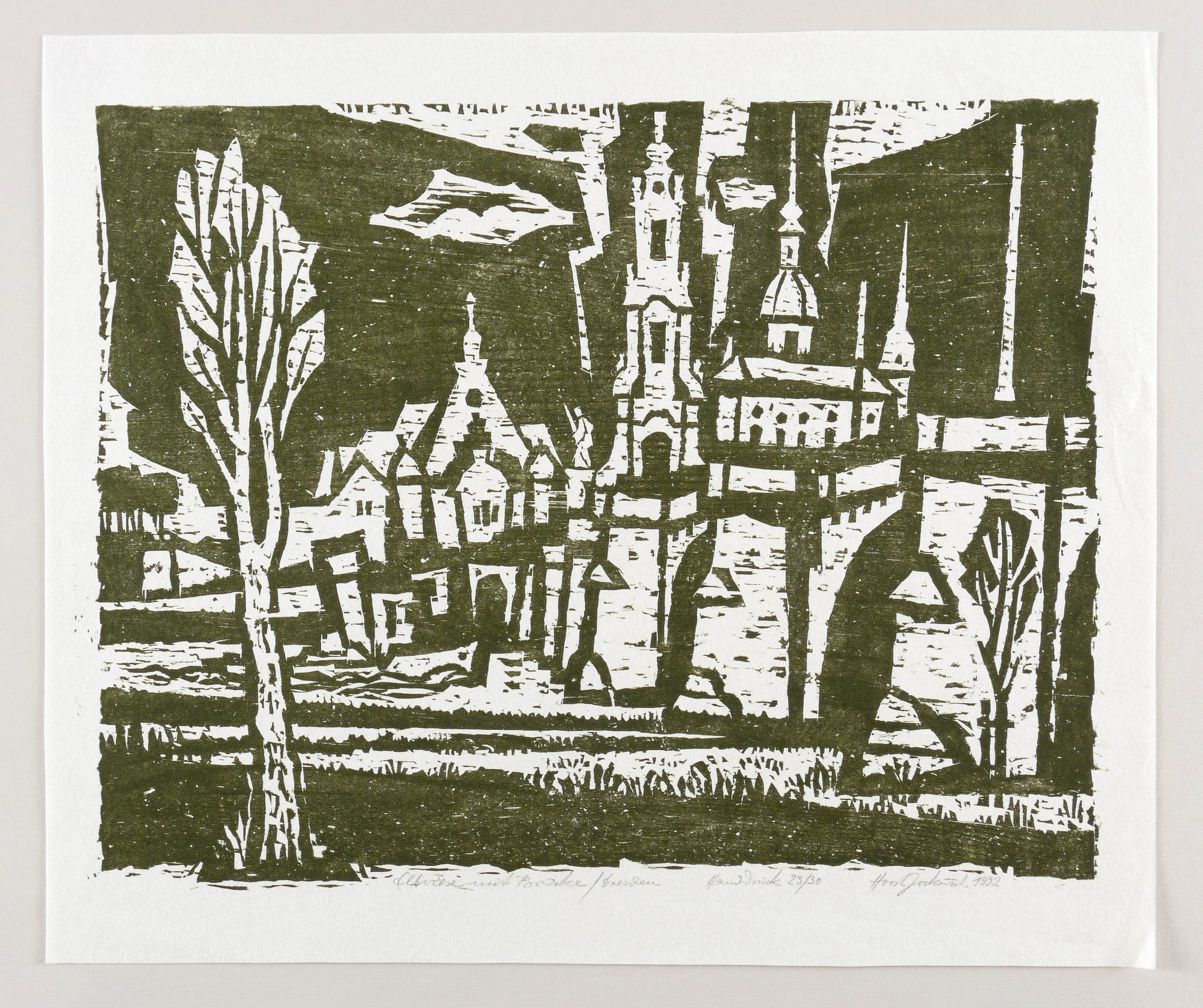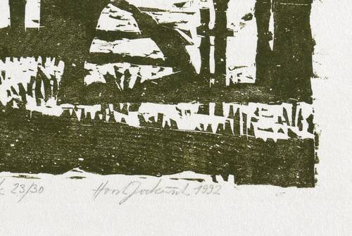 1992. Holzschnitt, in Schwarzgrün, auf rauem weißlichem Vließpapier. – Originale Künstlergrafik, von Horst Jockusch. – Auflage Exemplar Nr. 23/30. – 34,0 x 44,3 cm (Darstellung / Druckstock), 42 x 50 cm (Blatt).