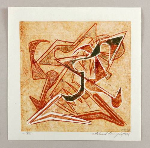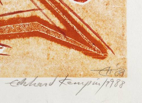1988. Farbmonotypie, in 3 Farben, auf leichtem weißem Maschinenpapier. – Originale Künstlergrafik, von Eckhard Kempin. – 17,0 x 17,1 cm (Darstellung), 21 x 21 cm (Blatt).