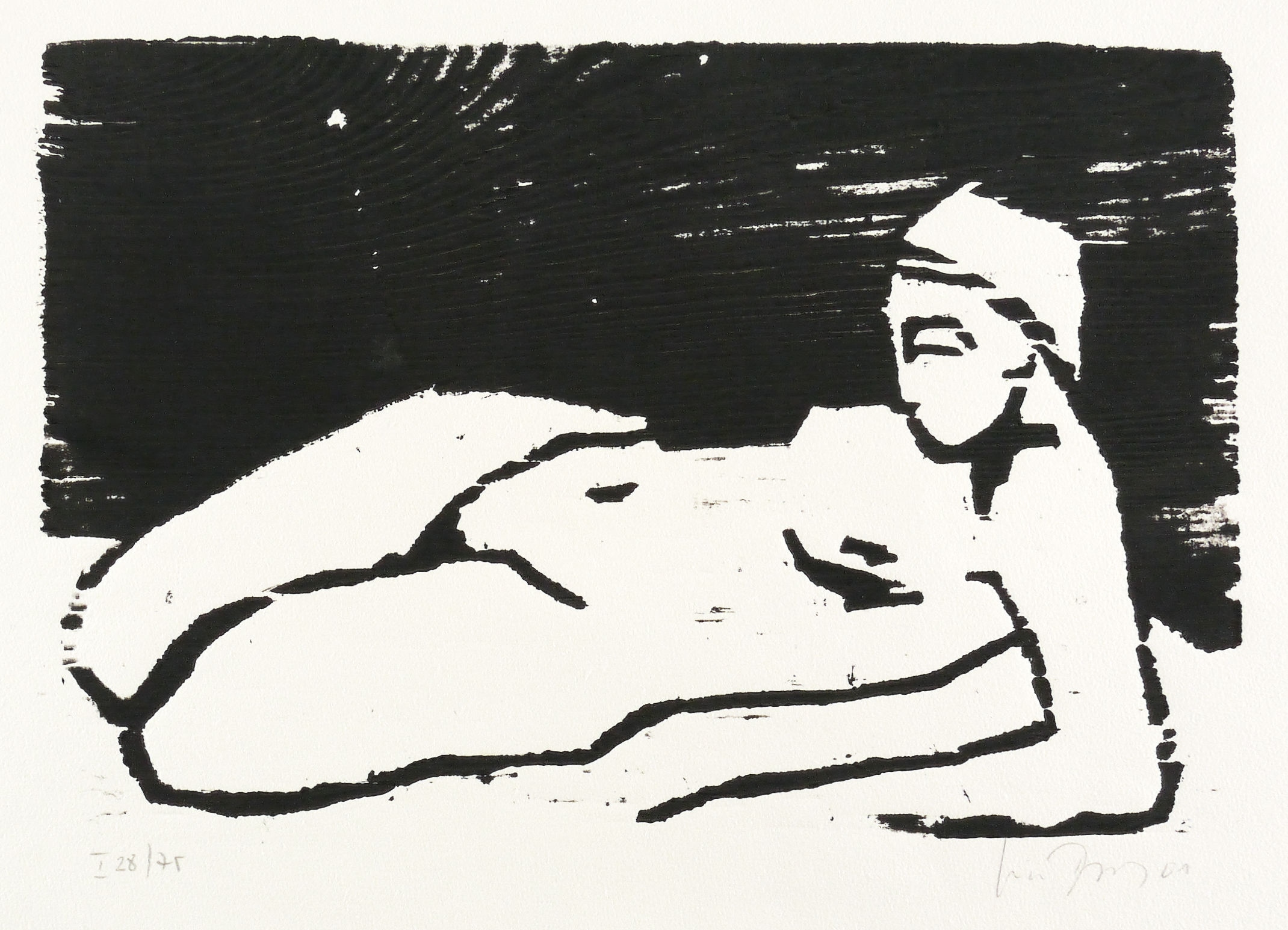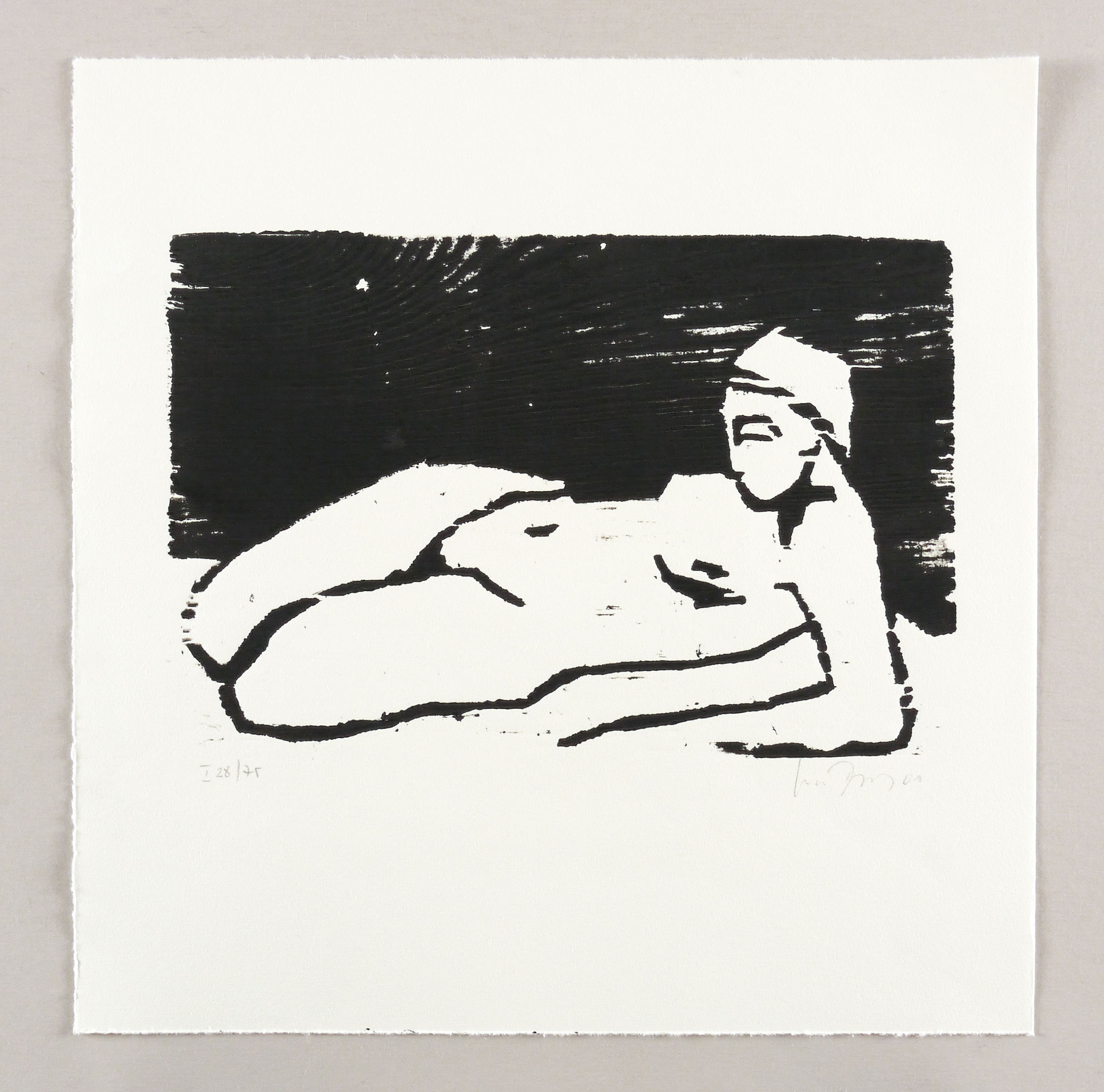 2001. Holzschnitt, in Schwarz, auf leichtem hellchamois Velin. – Originale Künstlergrafik, von Luise Dewerny. – Auflage Exemplar Nr. 28/75. – 19,0 x 28,5 cm (Darstellung / Druckstock), 35 x 35 cm (Blatt).