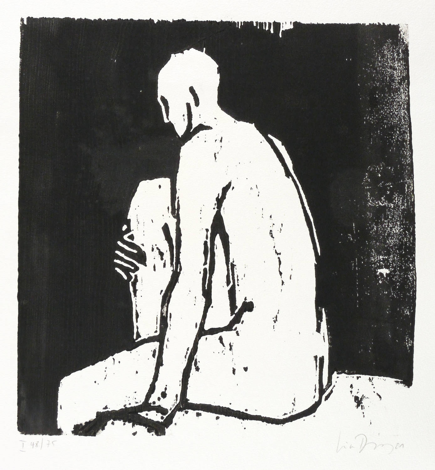 2001. Holzschnitt, in Schwarz, auf rauem hellchamois Velin. – Originale Künstlergrafik, von Luise Dewerny. – Auflage Exemplar Nr. 48/75. – 27,5 x 26,3 cm (Darstellung / Druckstock), 37 x 35 cm (Blatt).