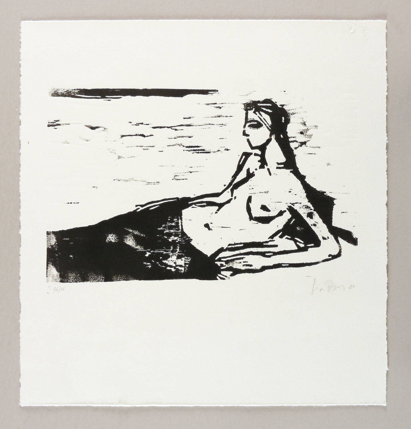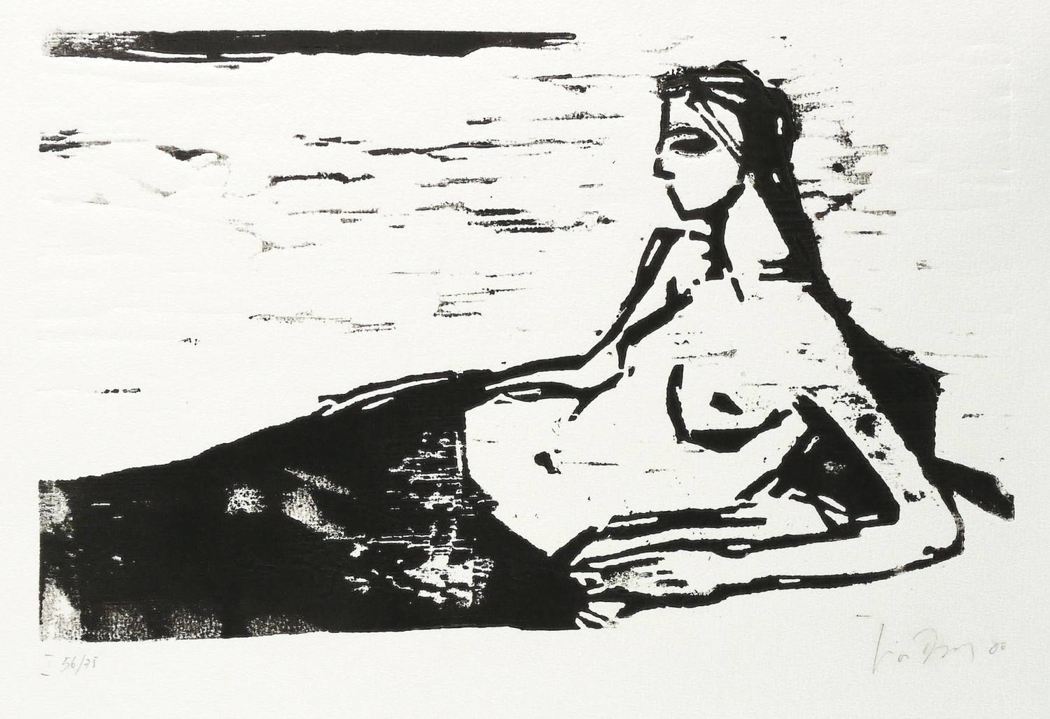 2000. Holzschnitt, in Schwarz, auf rauem hellchamois Velin. – Originale Künstlergrafik, von Luise Dewerny. – Auflage Exemplar Nr. 56/75. – 18,4 x 29,8 cm (Darstellung / Druckstock), 37 x 35 cm (Blatt).
