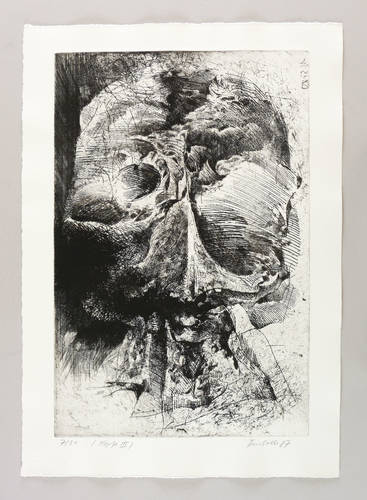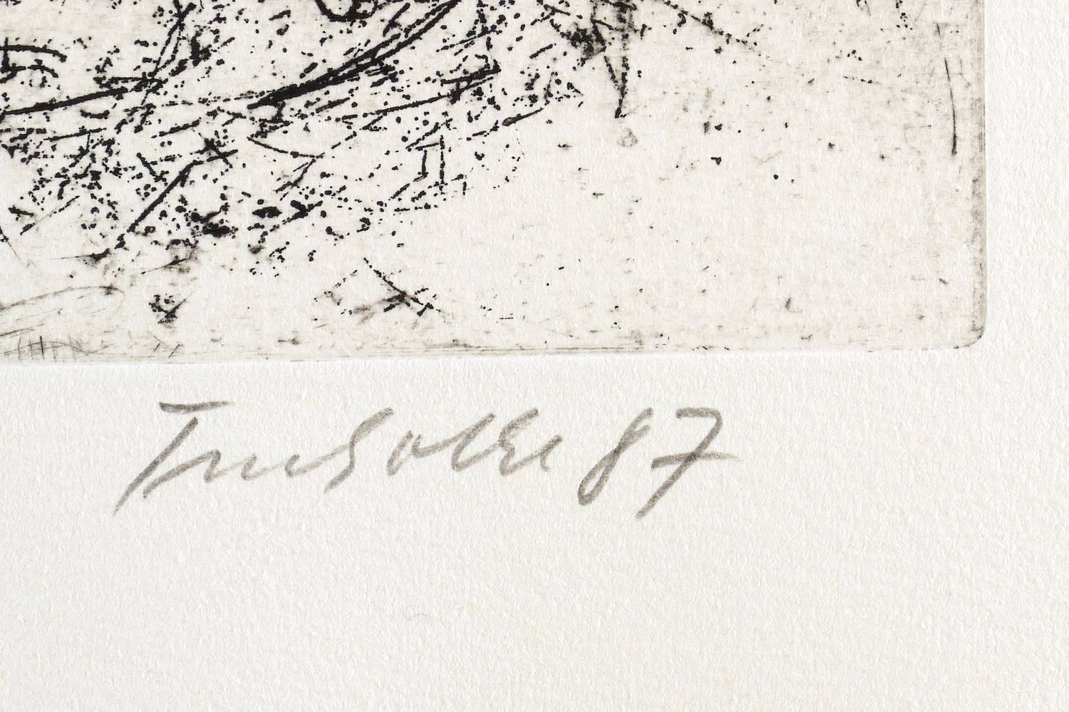 Aus: Dieter Tucholke, Die Nacht hat 12 Stunden. Ein Totentanz (Berlin: Staatlicher Kunsthandel der DDR 1987). – Rechts unten in Bleistift signiert und datiert: ″Tucholke 87″. Links Auflagenbezeichnung und Titel. Trockenstempel der Grafik-Edition. Wasserzeichen. – Tadellos erhalten. Sehr guter Zustand.