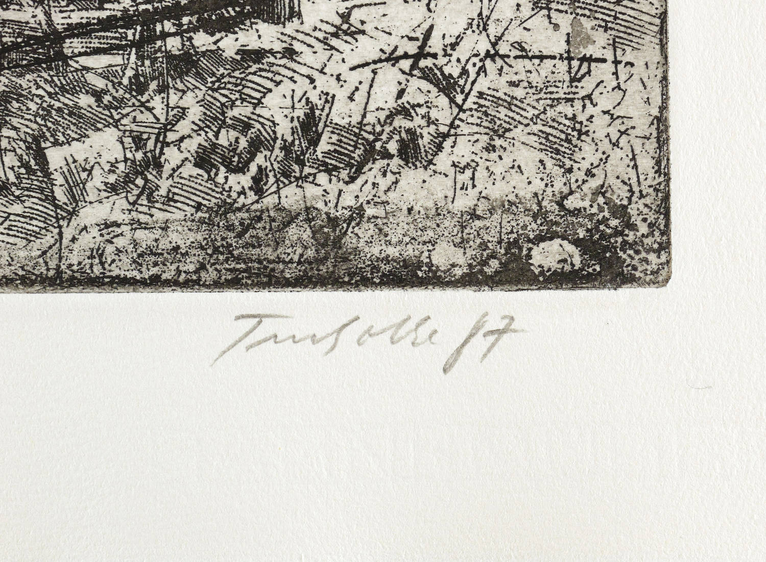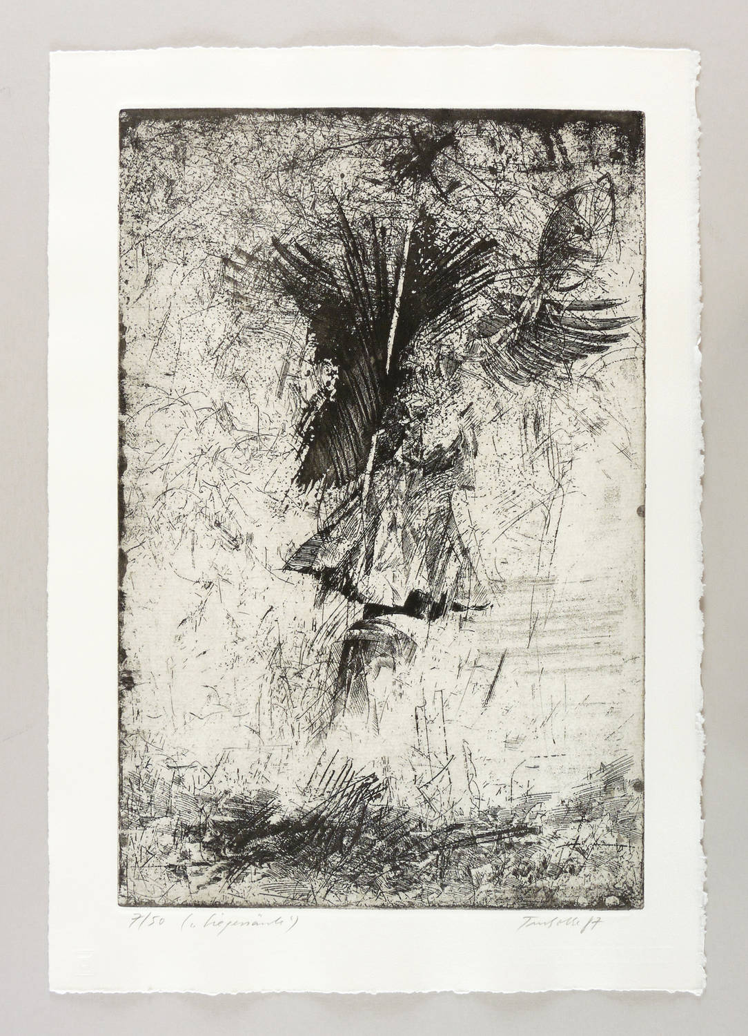 Aus: Dieter Tucholke, Die Nacht hat 12 Stunden. Ein Totentanz (Berlin: Staatlicher Kunsthandel der DDR 1987). – Rechts unten in Bleistift signiert und datiert: ″Tucholke 87″. Links Auflagenbezeichnung und Titel. Trockenstempel der Grafik-Edition. Wasserzeichen. – Tadellos erhalten. Sehr guter Zustand.