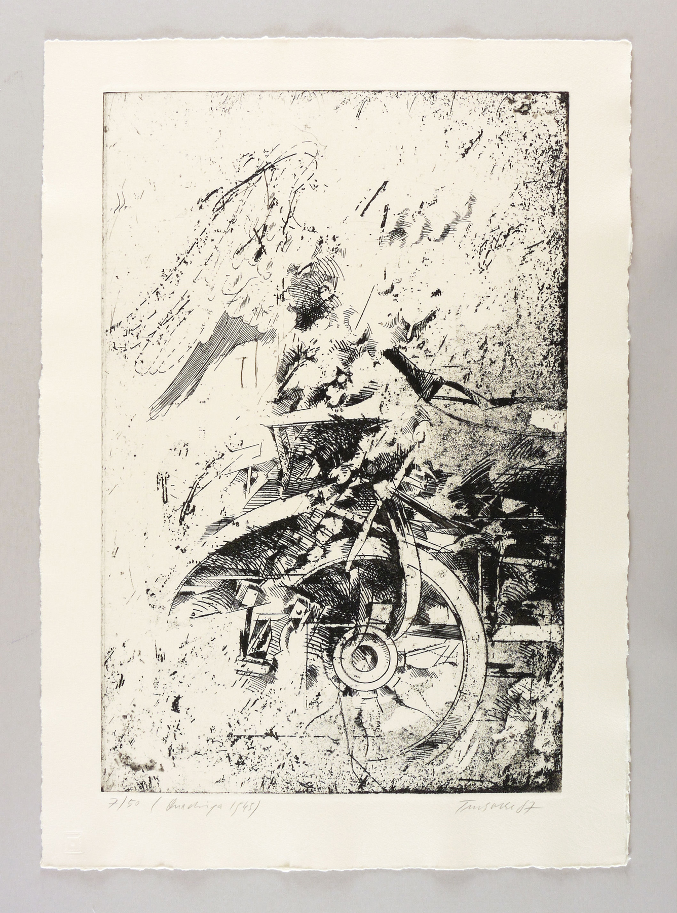 Aus: Dieter Tucholke, Die Nacht hat 12 Stunden. Ein Totentanz (Berlin: Staatlicher Kunsthandel der DDR 1987). – Rechts unten in Bleistift signiert und datiert: ″Tucholke 87″. Links Auflagenbezeichnung und Titel. Trockenstempel der Grafik-Edition. Wasserzeichen. – Tadellos erhalten. Sehr guter Zustand.
