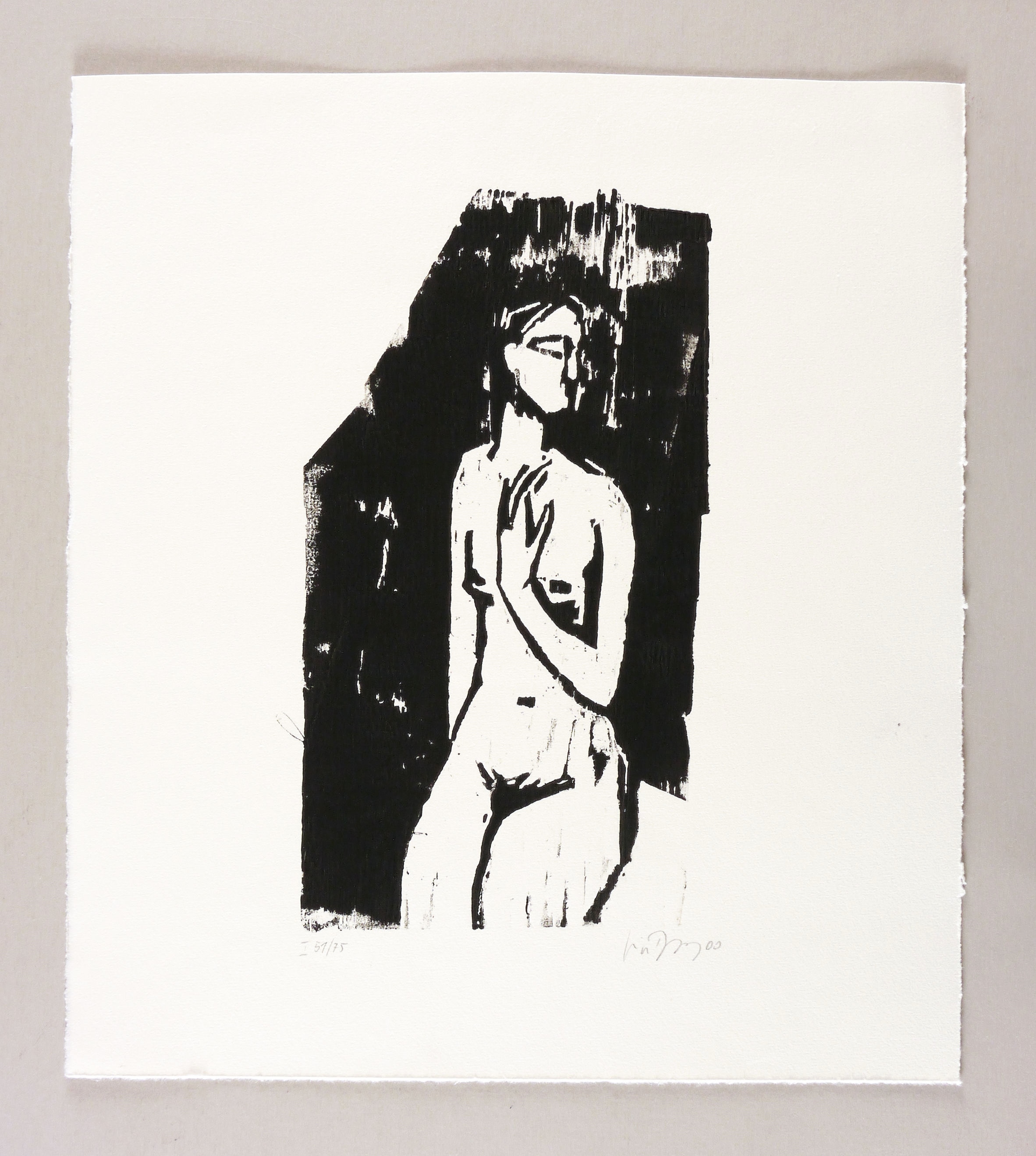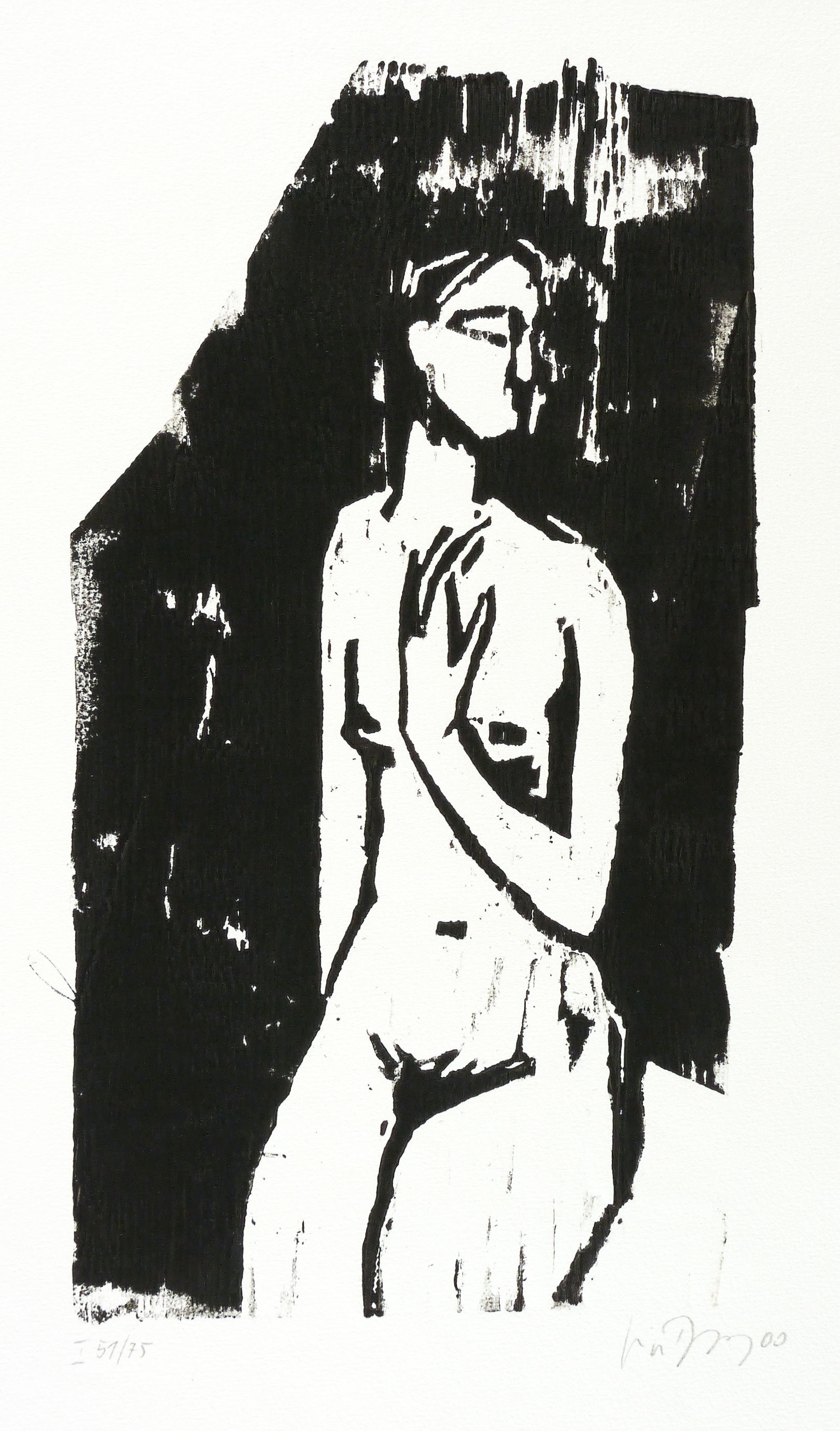 2000. Holzschnitt, in Schwarz, auf rauem hellchamois Velin. – Originale Künstlergrafik, von Luise Dewerny. – Auflage Exemplar Nr. 51/75. – 29,1 x 16,0 cm (Darstellung / Druckstock), 40 x 36 cm (Blatt).