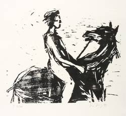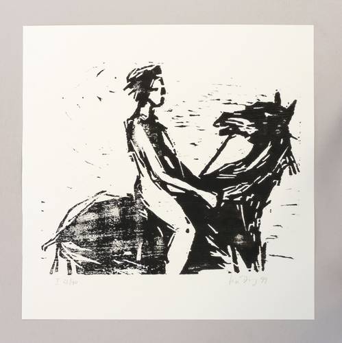 1999. Holzschnitt, in Schwarz, auf hellchamois Tonpapier. – Originale Künstlergrafik, von Luise Dewerny. – Auflage Exemplar Nr. 23/40. – 25,3 x 30,8 cm (Darstellung / Druckstock), 35 x 35 cm (Blatt).