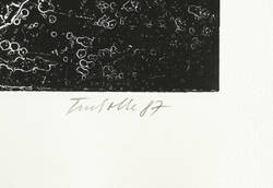 Aus: Dieter Tucholke, Die Nacht hat 12 Stunden. Ein Totentanz (Berlin: Staatlicher Kunsthandel der DDR 1987). – Rechts unten in Bleistift signiert und datiert: ″Tucholke 87″. Links Auflagenbezeichnung und Titel. Trockenstempel der Grafik-Edition. Wasserzeichen. – Tadellos erhalten. Sehr guter Zustand.