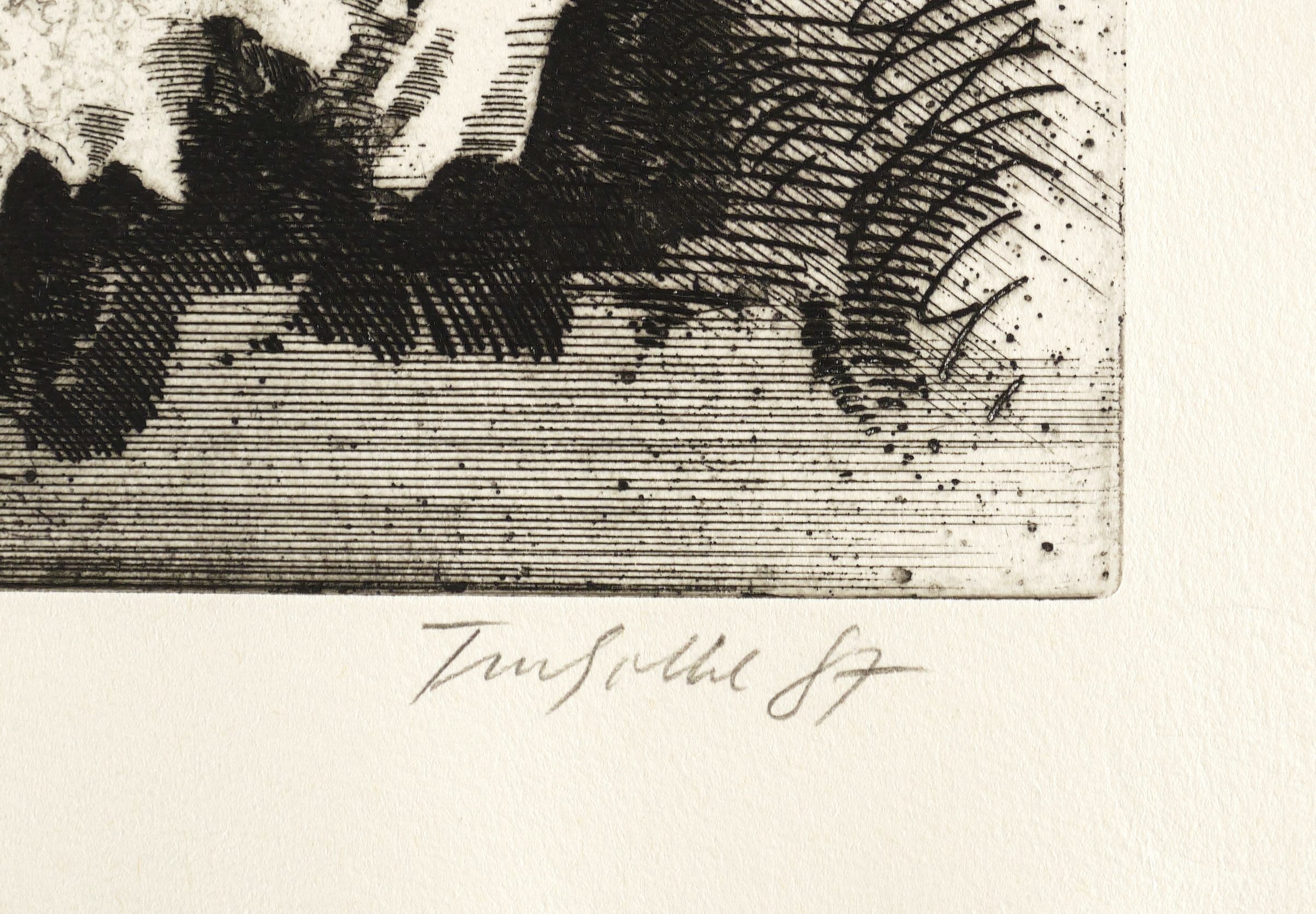Aus: Dieter Tucholke, Die Nacht hat 12 Stunden. Ein Totentanz (Berlin: Staatlicher Kunsthandel der DDR 1987). – Rechts unten in Bleistift signiert und datiert: ″Tucholke 87″. Links Auflagenbezeichnung und Titel. Trockenstempel der Grafik-Edition. Wasserzeichen. – Tadellos erhalten. Sehr guter Zustand.
