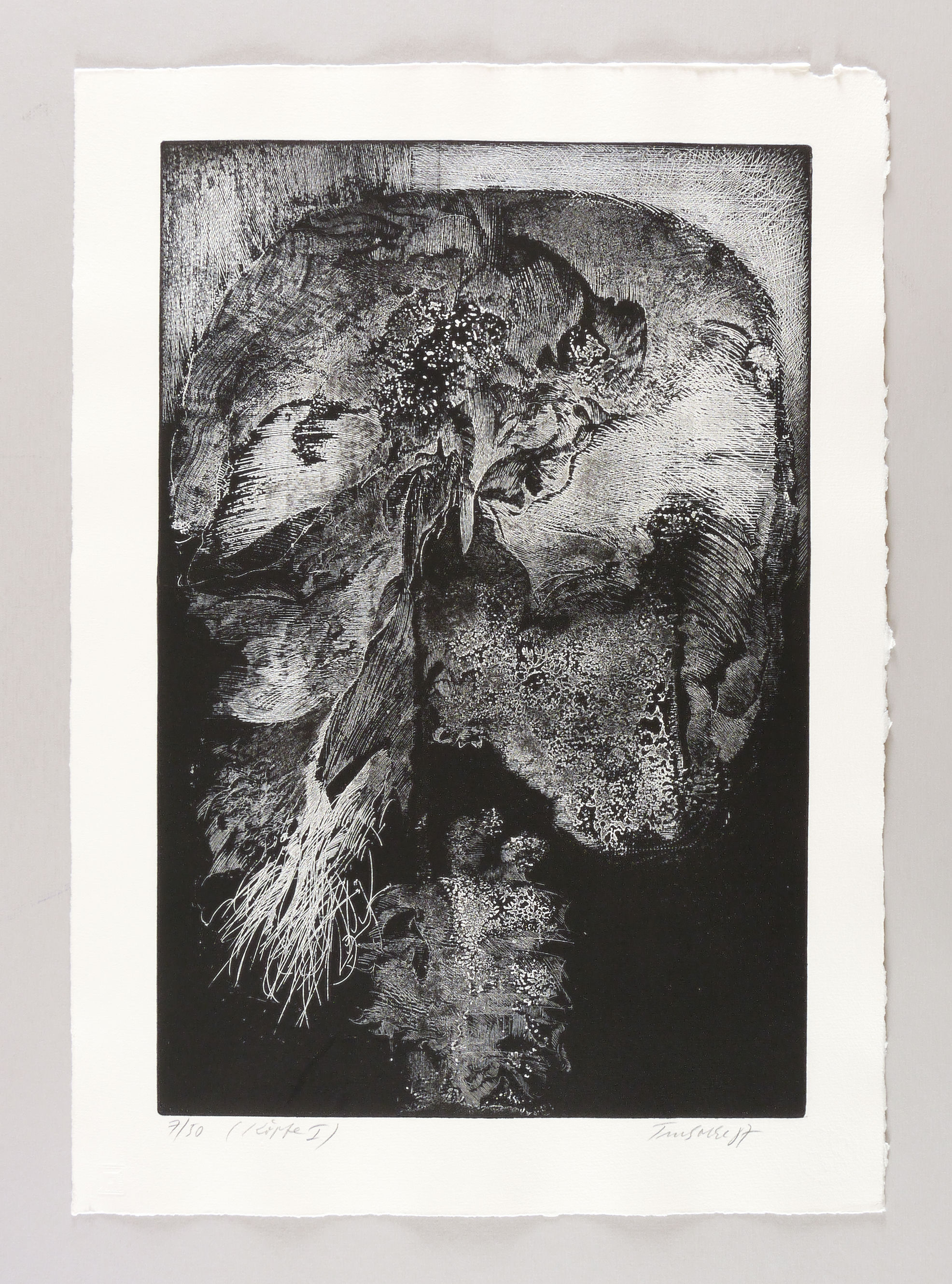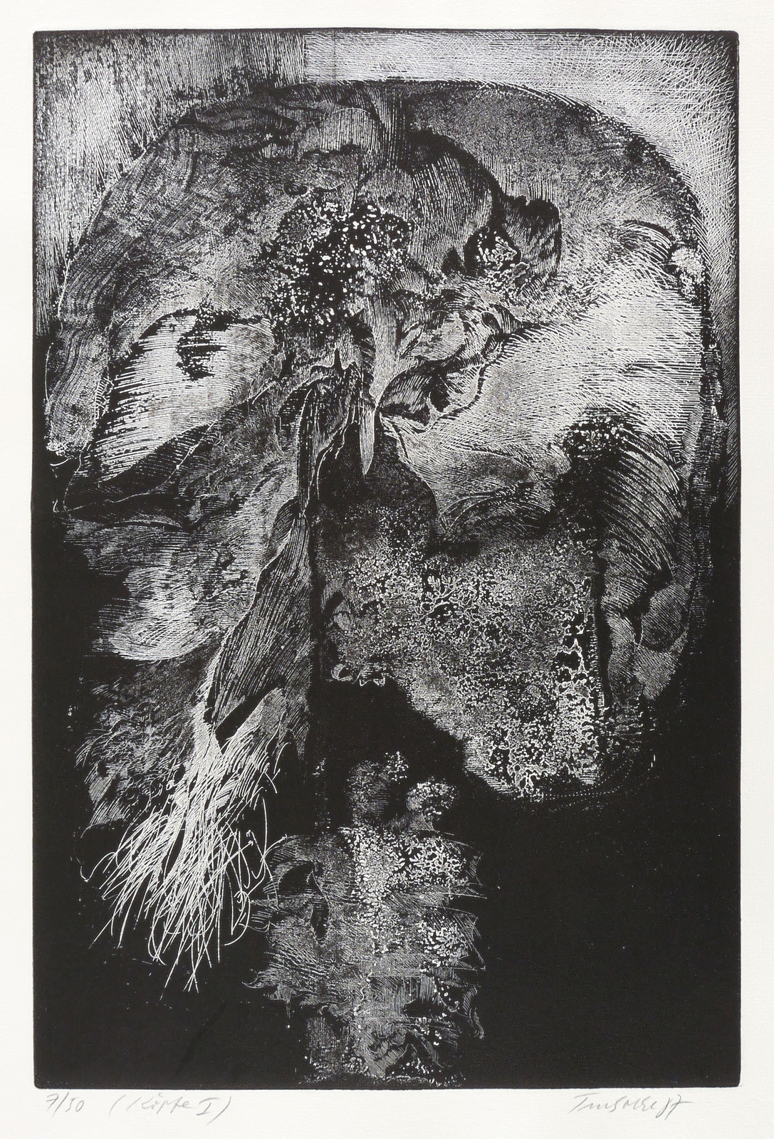 1987. Radierung / Reservage, geschabt, in Schwarz, auf schwerem Hahnemühle. – Originale Künstlergrafik, von Dieter Tucholke. – Auflage Exemplar Nr. 7/50. – 49,3 x 33,0 cm (Darstellung / Platte), 59 x 42 cm (Blatt).