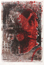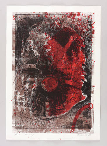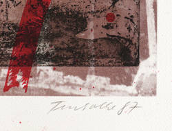 1987. Mischtechnik / Farbsiebdruck & Radierung, in Rot, Braun & Schwarz, auf starkem hellchamois Velin. – Originale Künstlergrafik, von Dieter Tucholke. – Auflage Exemplar Nr. 7/50. – 52,3 x 35,6 cm (Darstellung / Druckbild), 58 x 41 cm (Blatt).