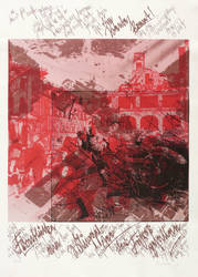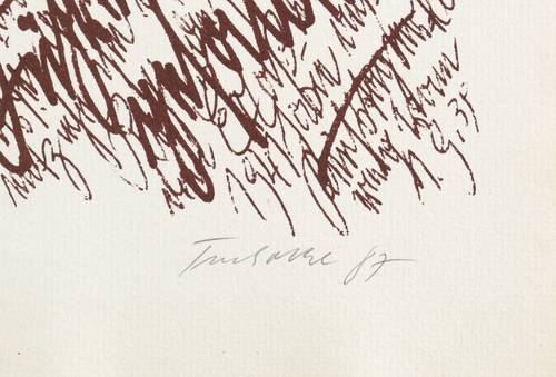 1987. Mischtechnik / Farbsiebdruck & Radierung, in Rot, Braun & Schwarz, auf hellchamois Maschinenbütten. – Originale Künstlergrafik, von Dieter Tucholke. – Auflage Exemplar Nr. 7/50. – 36,3 x 36,0 cm (Darstellung / ohne Schrift), 50,8 x 36,0 cm (Darstellung / mit Schrift), 58 x 41 cm (Blatt).