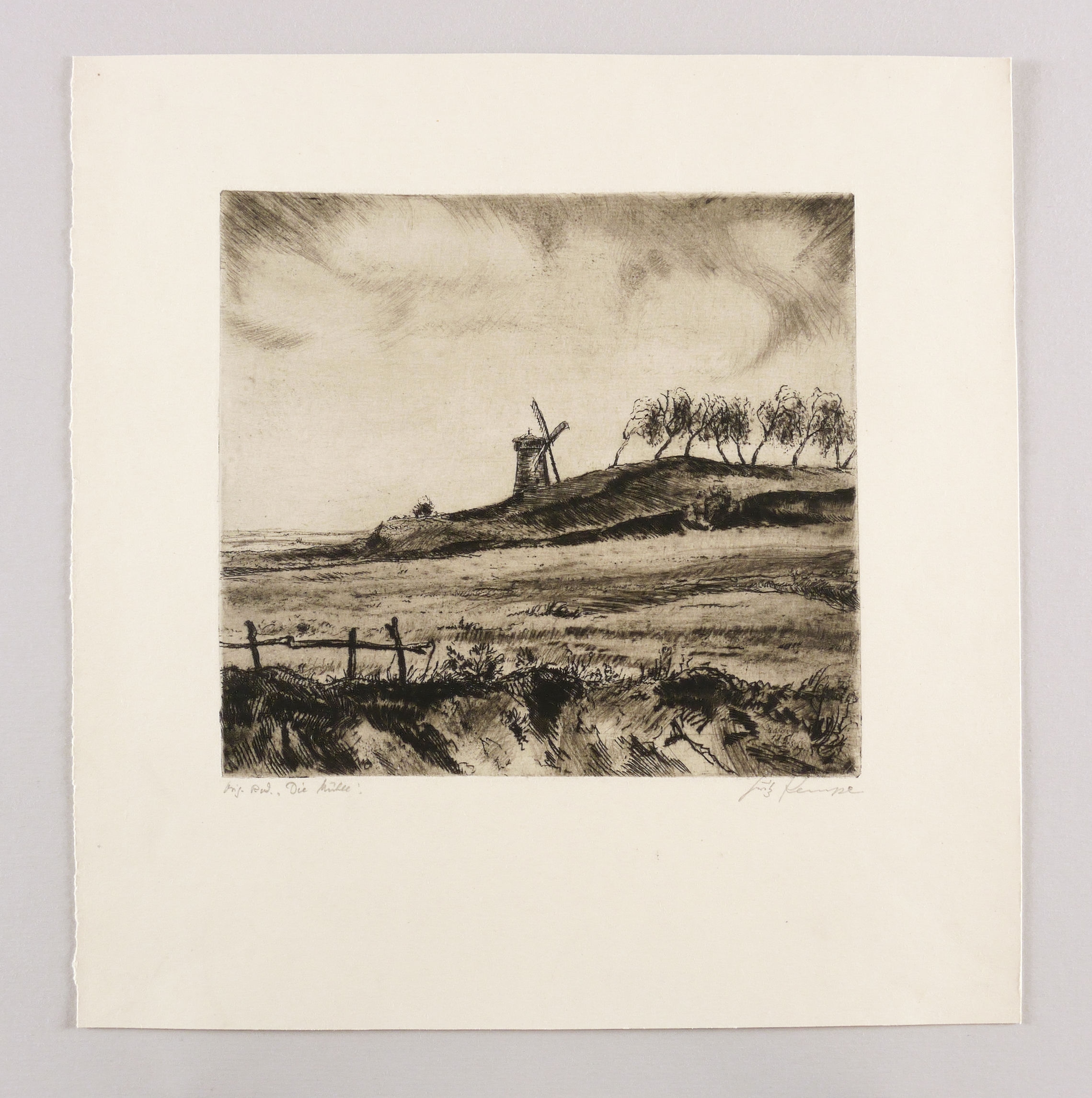 Rechts unten in Bleistift signiert: ″Fritz Kempe″. Links bezeichnet: ″Orig. Rad. 'Die Mühle'″. – Frühwerk und Belegexemplar aus dem Nachlass Künstlers. - Selten. – Tadellos. Sehr guter Zustand.