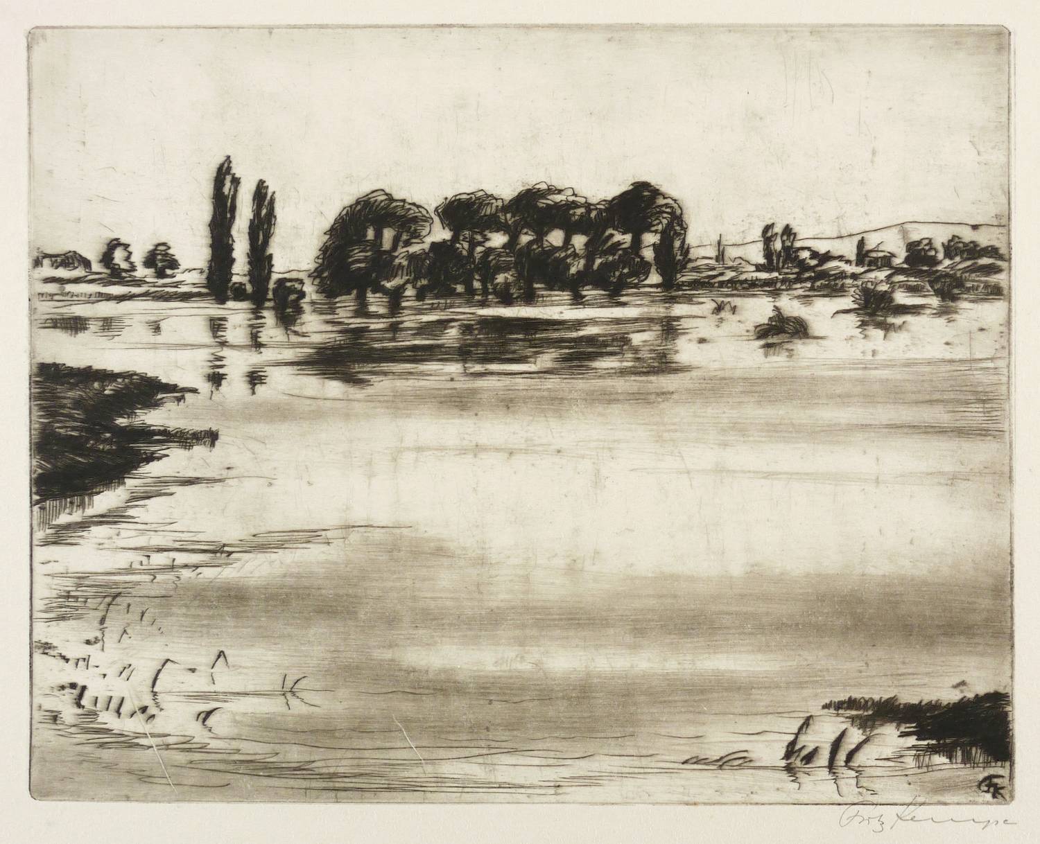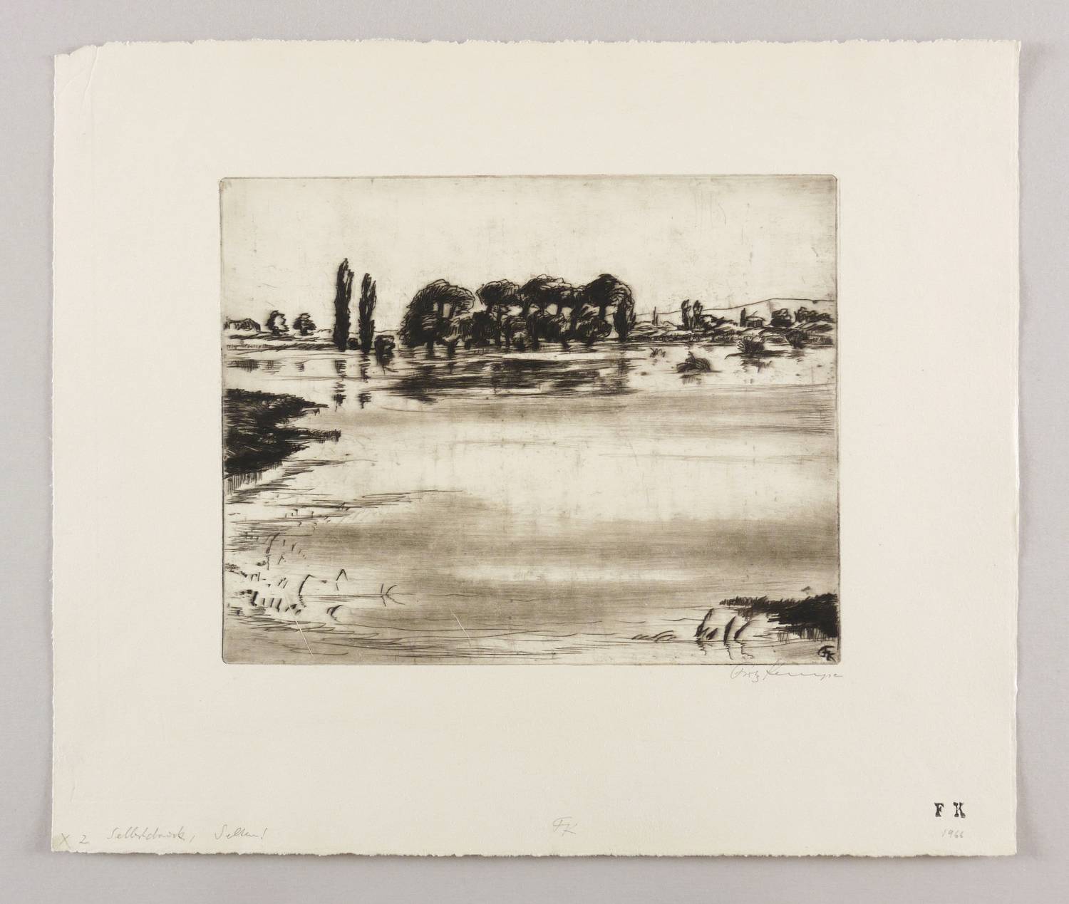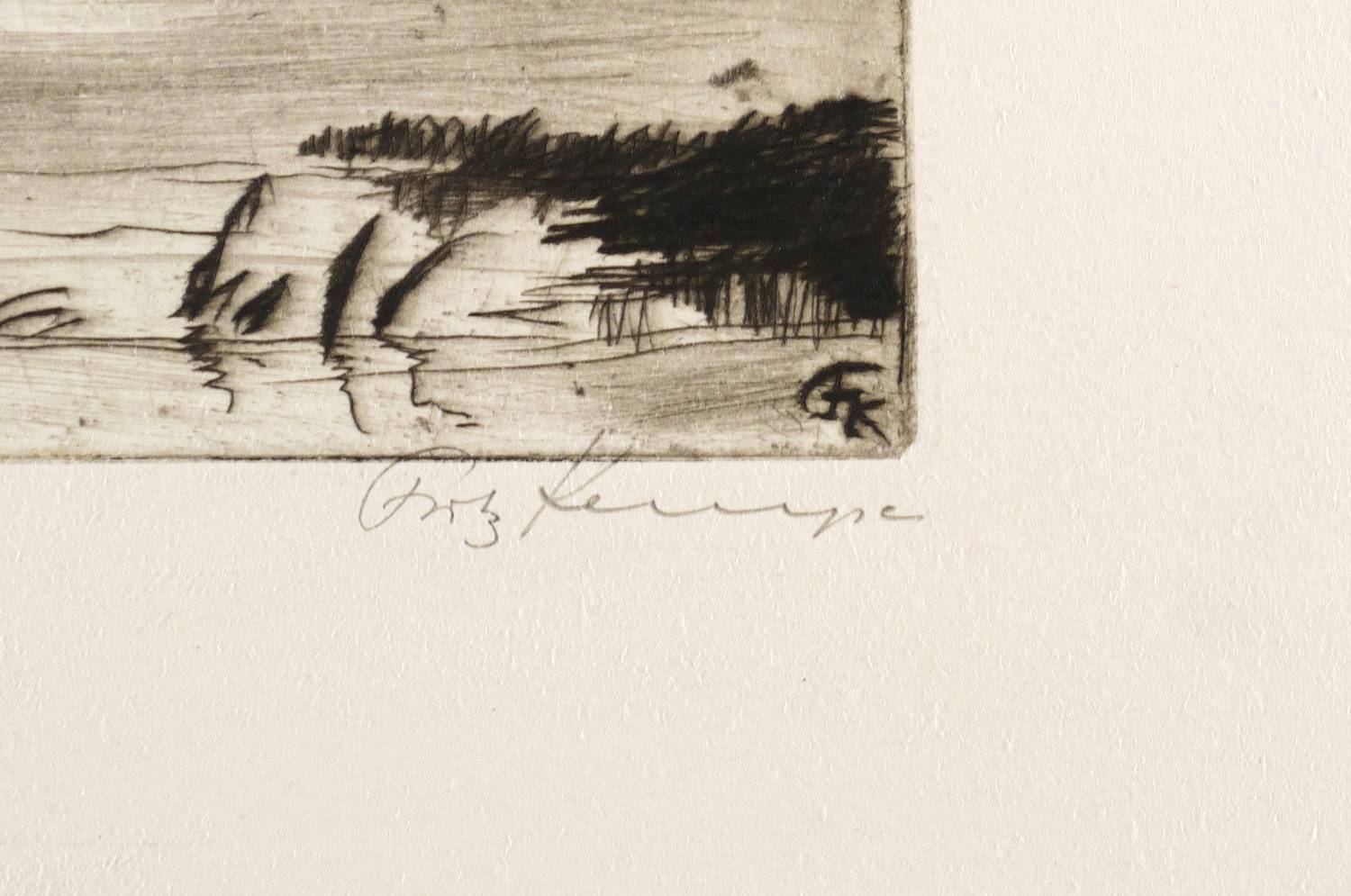 Rechts unten in Bleistift signiert: ″Fritz Kempe″. Am Blattrand unten bezeichnet und monogrammiert: ″Selbstdruck, Selten! 'Hochwasser' / FK″. rechts Monogramm-Stempel des Künstlers. Dazu datiert: ″1966″. In der Platte rechts unten nochmals Monogramm. – Sehr guter Zustand.