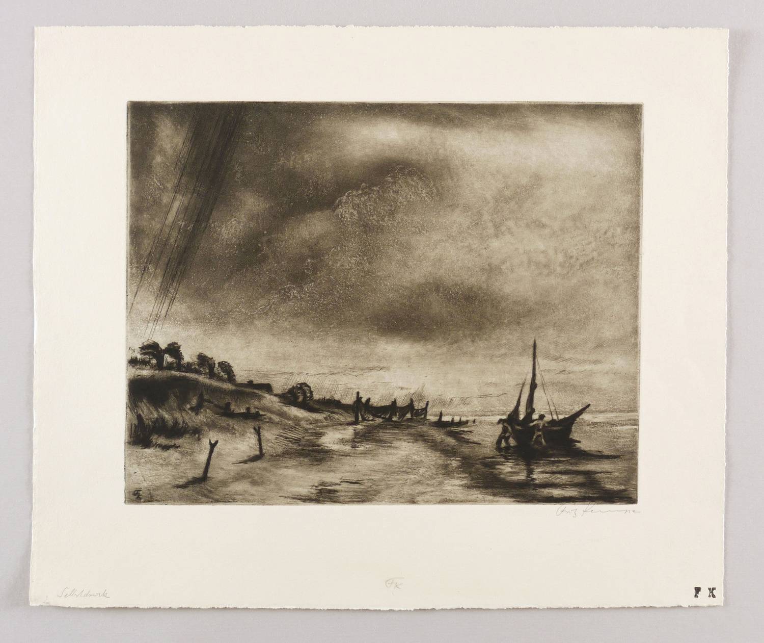 Rechts unten in Bleistift signiert: ″Fritz Kempe″. Am Blattrand unten bezeichnet und monogrammiert: ″x3 Selbstdruck / FK″. In der rechten unteren Blattecke Monogramm-Stempel des Künstlers. In der Platte links unten nochmals Monogramm. – Tadellos erhalten. Sehr guter Zustand.