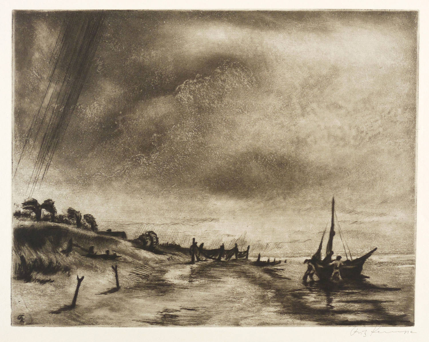 1930-1940. Radierung / Aquatinta, Strichätzung & Kaltnadel, partiell geschliffen, in Schwarz, auf weichem hellgelbem Velin. – Originale Künstlergrafik, von Fritz Kempe. – 22,3 x 28,4 cm (Darstellung / Platte), 33 x 38 cm (Blatt).