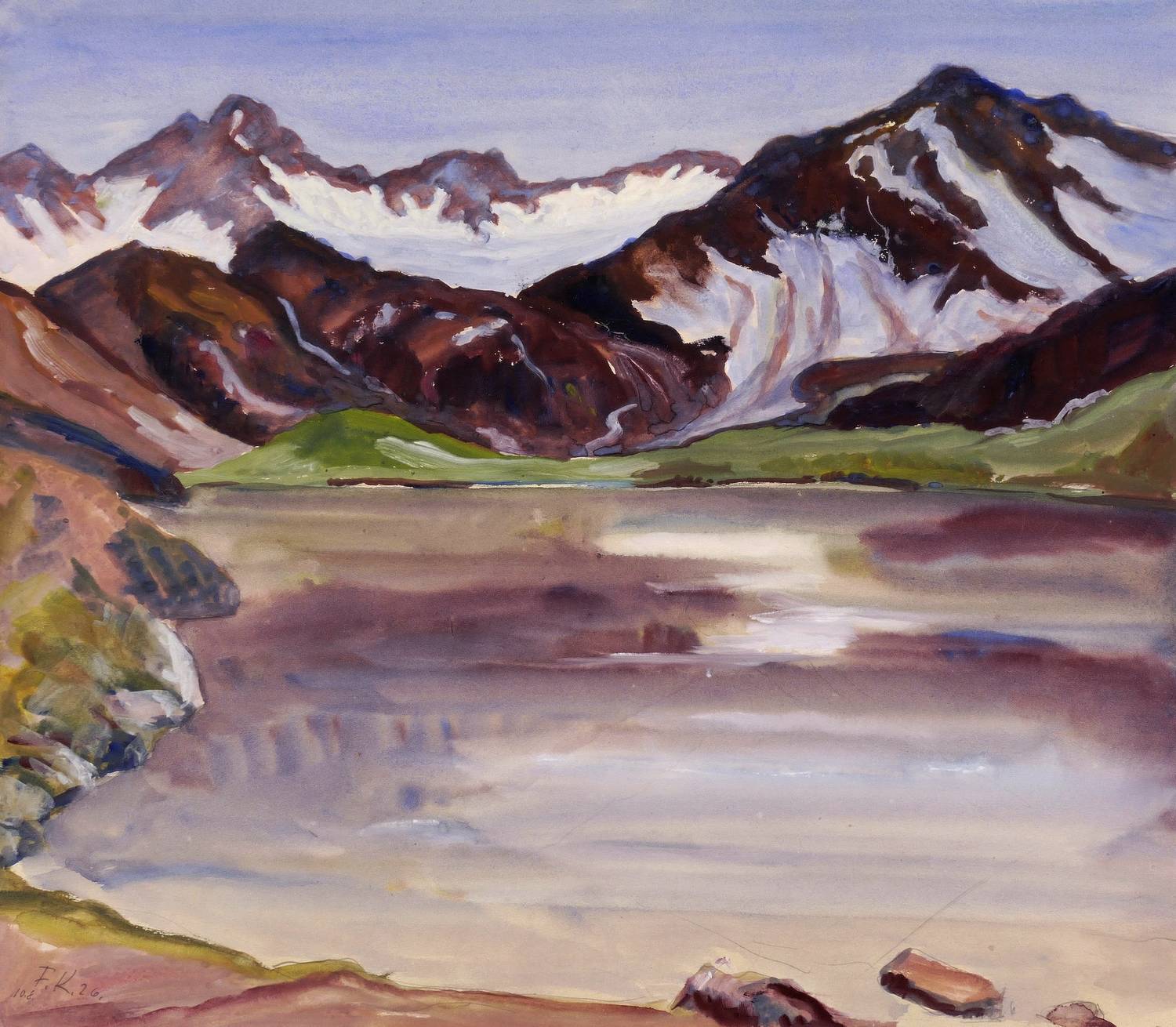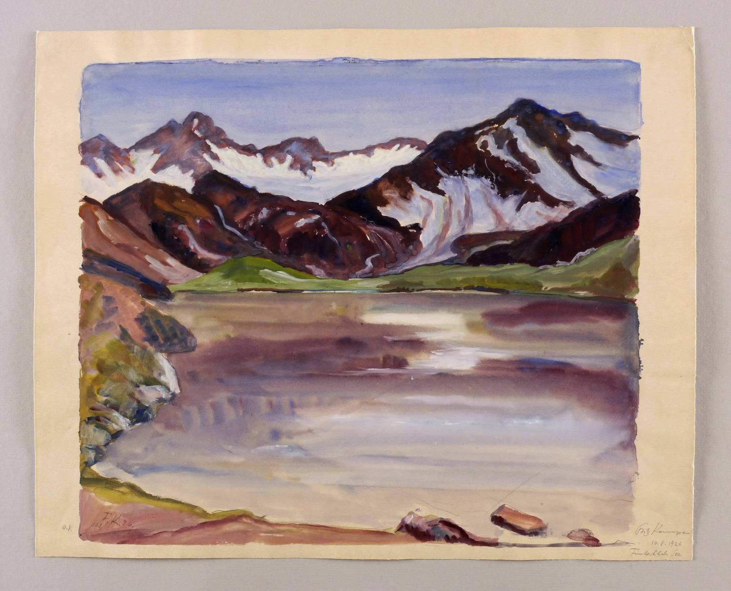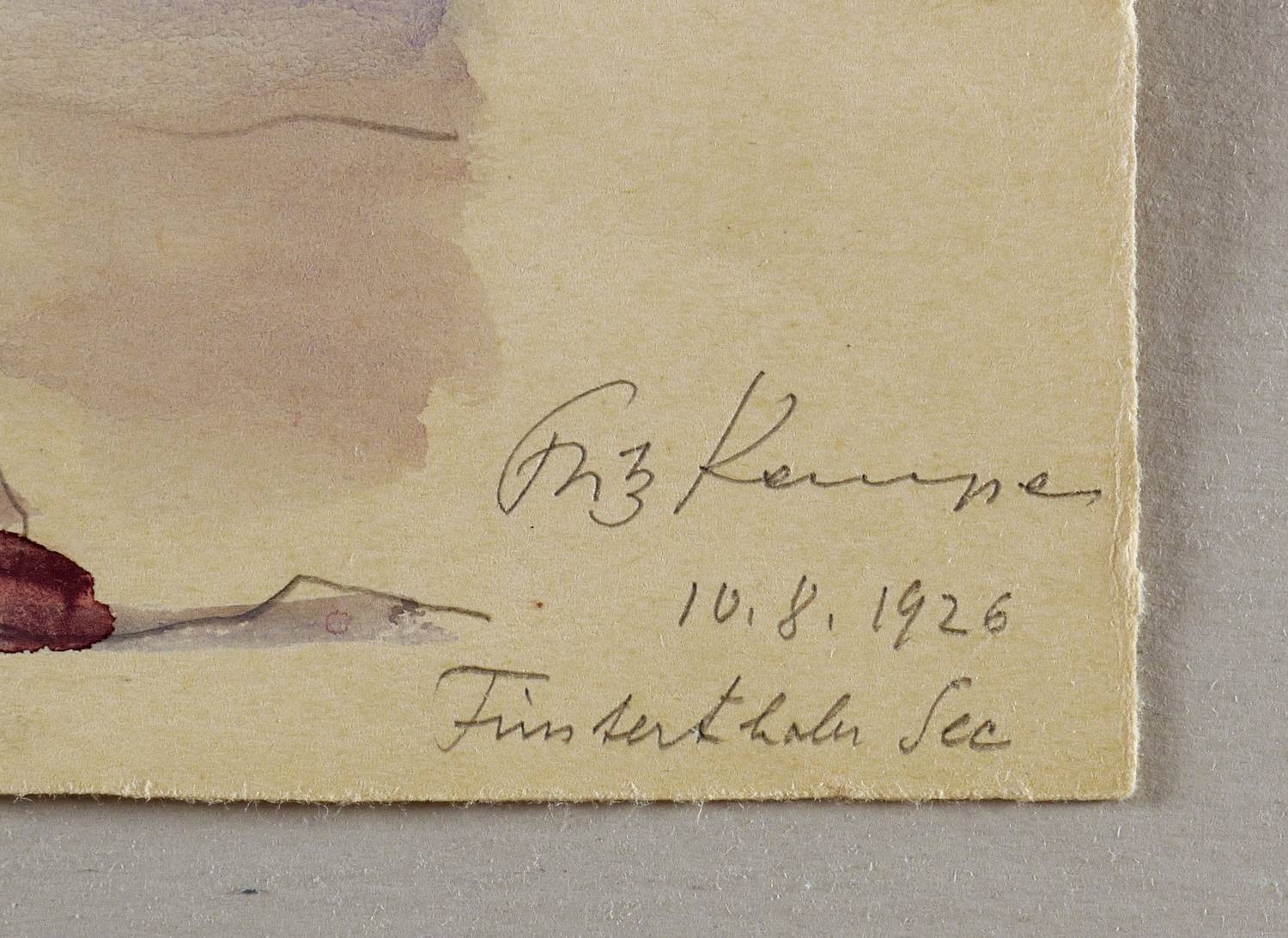 Links unten in der Darstellung mit Bleistift signiert und datiert: ″10.8. F.K. 26″. Rechts unten nochmals ausführlich signiert, datiert und betitelt: ″Fritz Kempe 10.8.1926 Finsterthaler See″. – Provenienz: Nachlass der zweiten Ehefrau Martha (Marthel) Müller-Kempe, Dresden. – Farbfrisch, kontrastreich. Tadellos erhalten. Sehr guter Zustand.