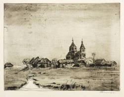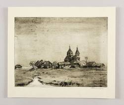 Rechts unten in Bleistift signiert: ″F. Kempe″. – Eine sehr ähnliche, vielleicht aber nicht identische Holzkirche russischen Stils, die 1866 erbaute römisch-katholische Kirche Konstantin und Alena in Waloschyn (Валожын), nordöstlich von Minsk. – Sehr guter Zustand.