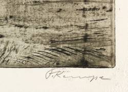1943-1945. Radierung / Kaltnadel, mit Plattenton, in Schwarz, auf festem hellgelbem Velin. – Originale Künstlergrafik, von Fritz Kempe. – 18,8 x 24,6 cm (Darstellung / Platte), 26 x 29 cm (Blatt).