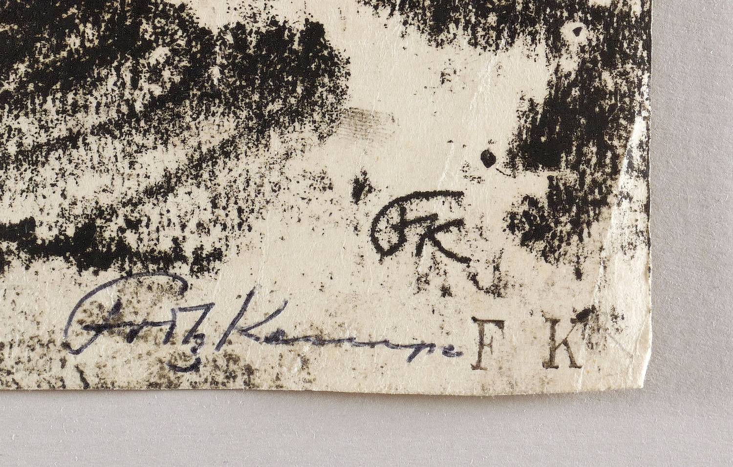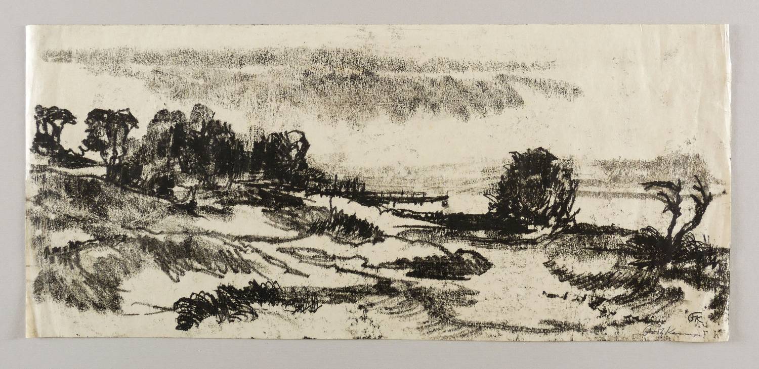 In Bleistift in der Darstellung rechts unten signiert: ″Fritz Kempe″. Dazu Monogramm-Stempel des Künstlers. Verso eigenhändig bezeichnet: ″FK / Fritz Kempe / 'Am Strand', Monotypie / 1961″. – Randloser Druck. - Aus dem Nachlass des Künstlers. - Darstellung zeitg wohl eine Uferzone der Elbe zwischen Dresden Altstadt und Meißen bei Kaditz. – Papier im Rand vor allem rechts knickspurig. Insgesamt nur mangelhafter bis mäßig guter Zustand.