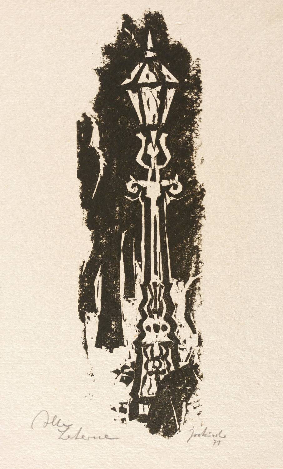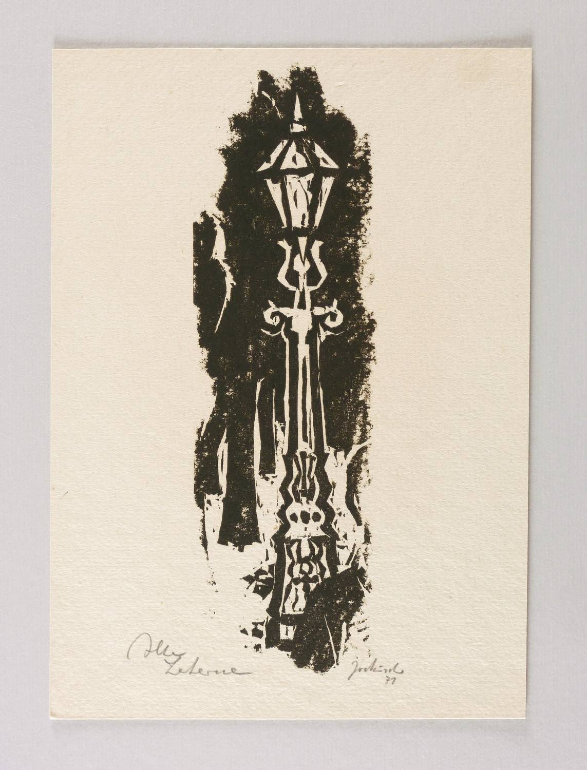 1971. Holzschnitt, in Schwarz, auf wolkigem hellbraunem Velin. – Originale Künstlergrafik, von Horst Jockusch. – 25,7 x 7,9 cm (Darstellung / Druckbild), 29 x 21 cm (Blatt).