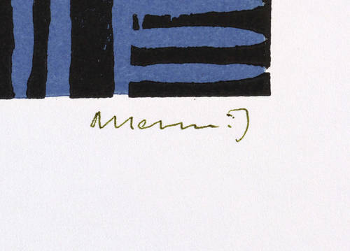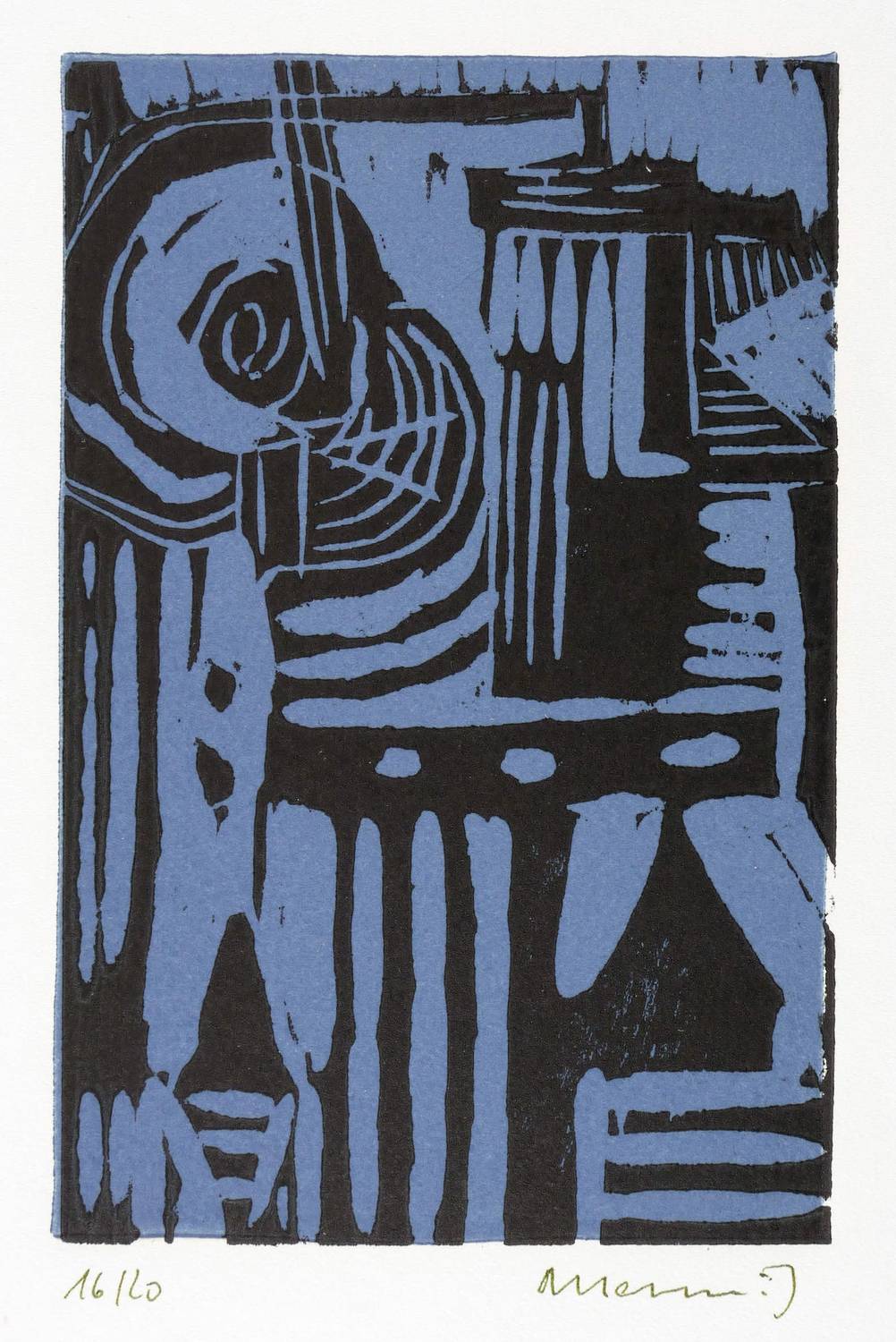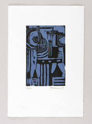 Um 1965. Farblinolschnitt, in Dunkelblau & Schwarz, auf weißem Simili-Japan. – Originale Künstlergrafik, von Albert Hennig. – Auflage Exemplar Nr. 16/20. – 16,3 x 10,6 cm (Darstellung / Druckstock), 30 x 21 cm (Blatt).