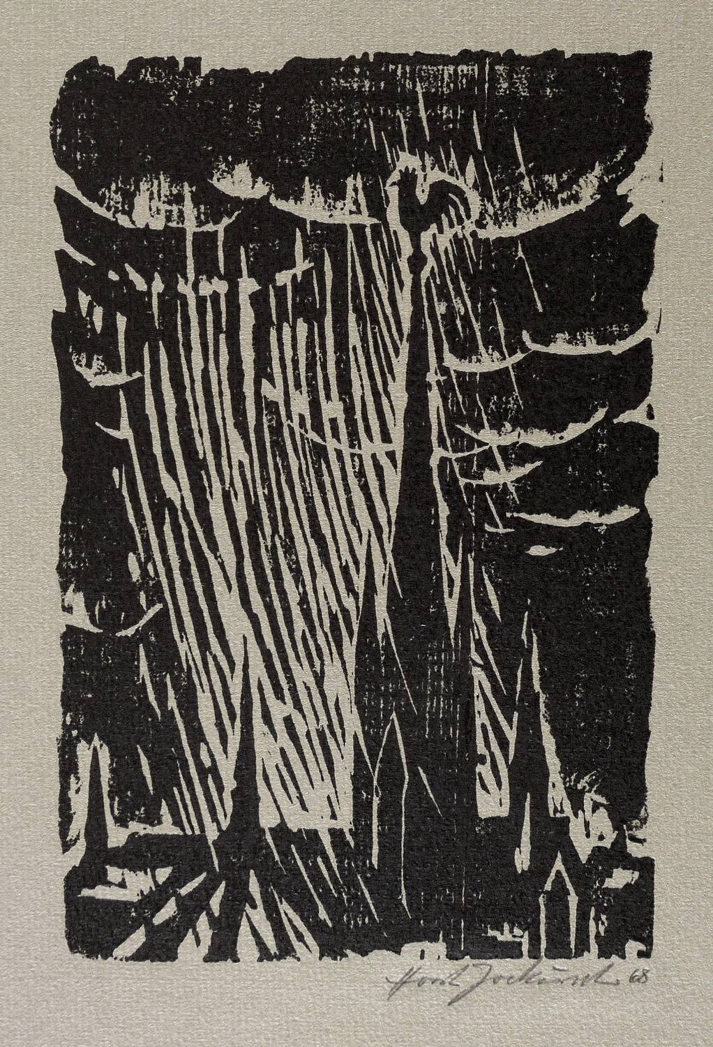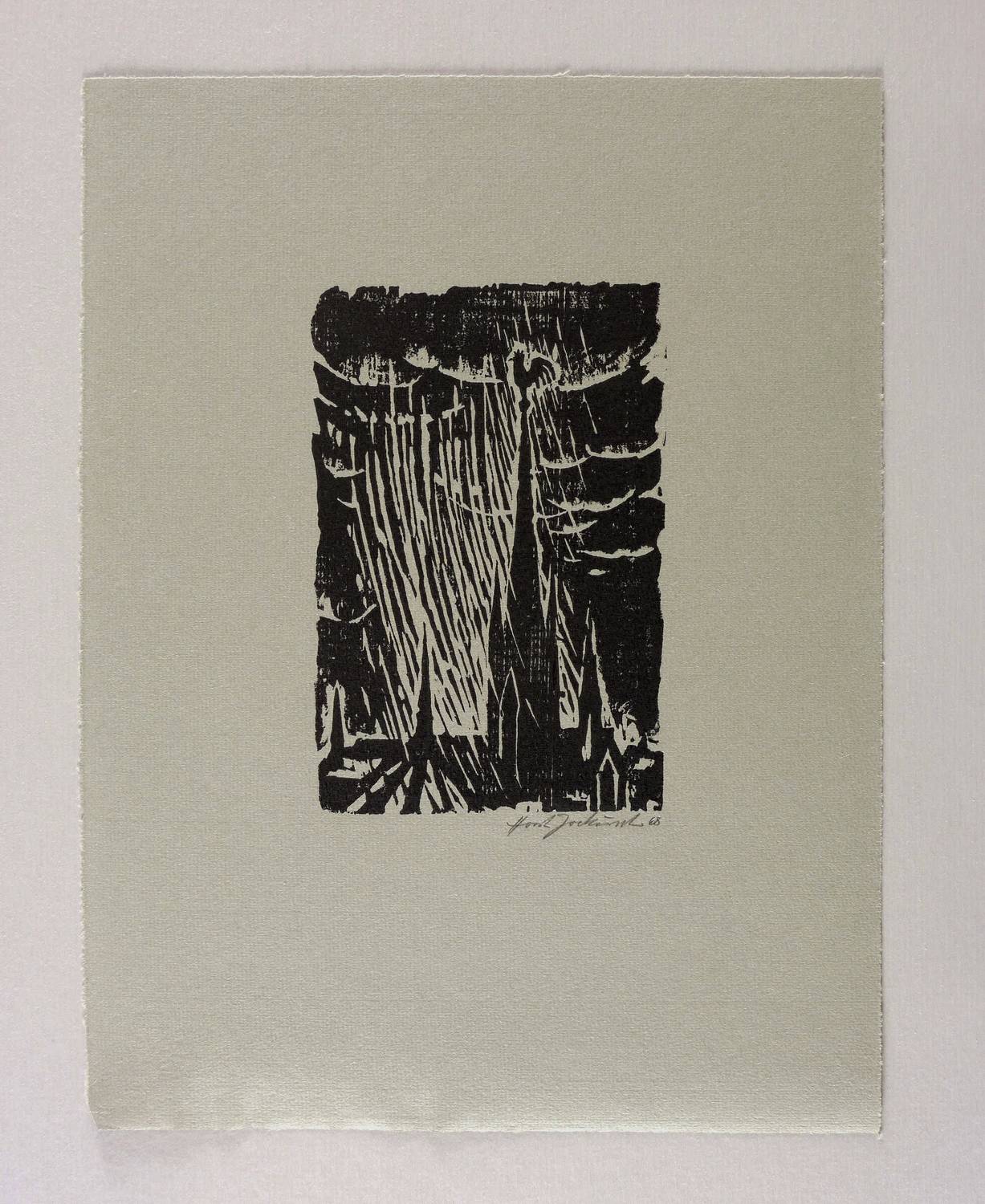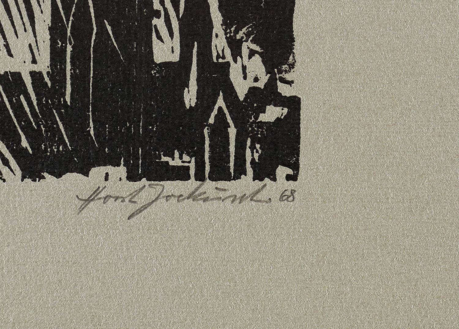 1968. Holzschnitt, in Schwarz, auf leichtem grüngrauem Hahnemühle-Bütten. – Originale Künstlergrafik, von Horst Jockusch. – 16,0 x 10,6 cm (Darstellung / Druckbild), 32 x 24 cm (Blatt).