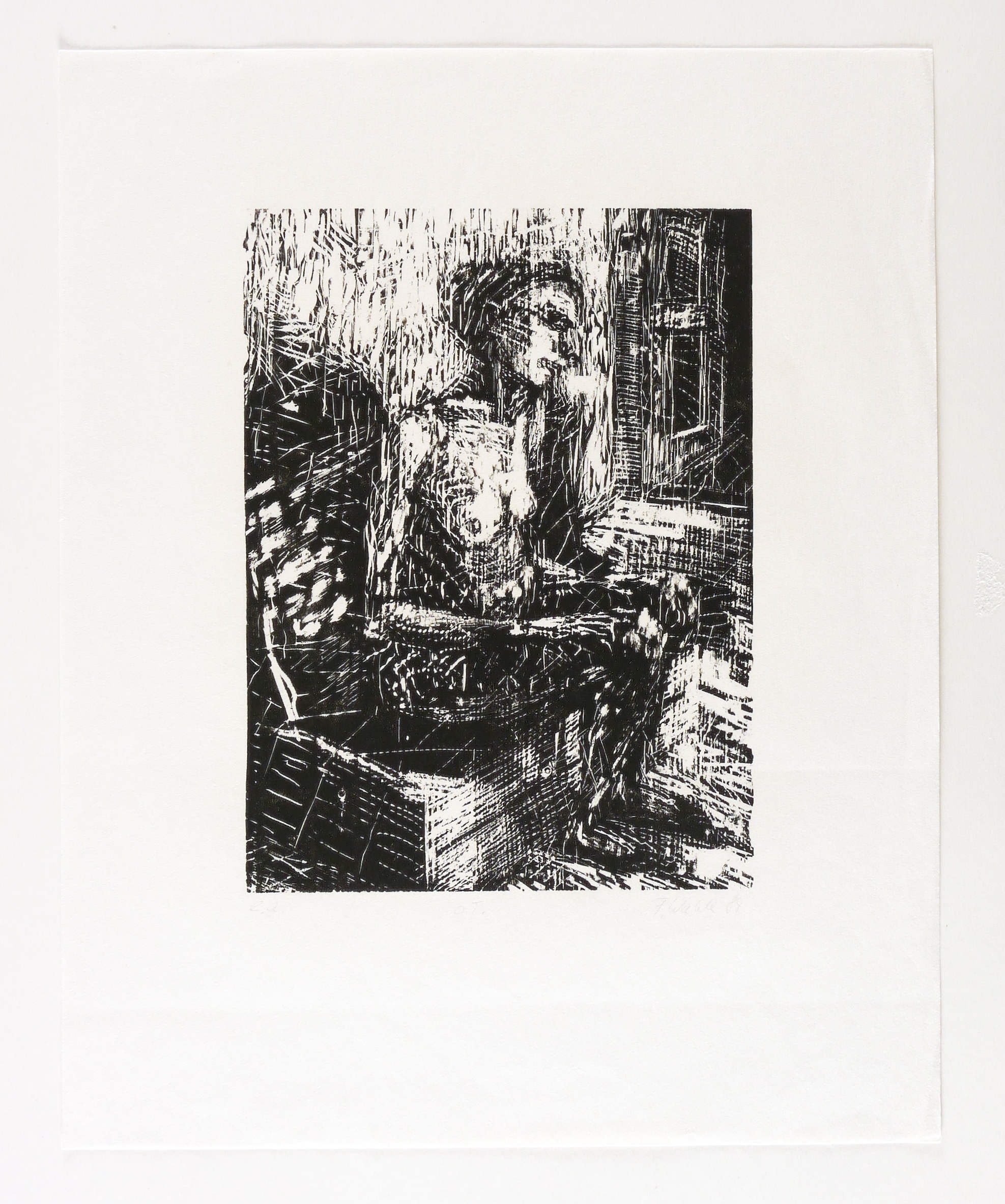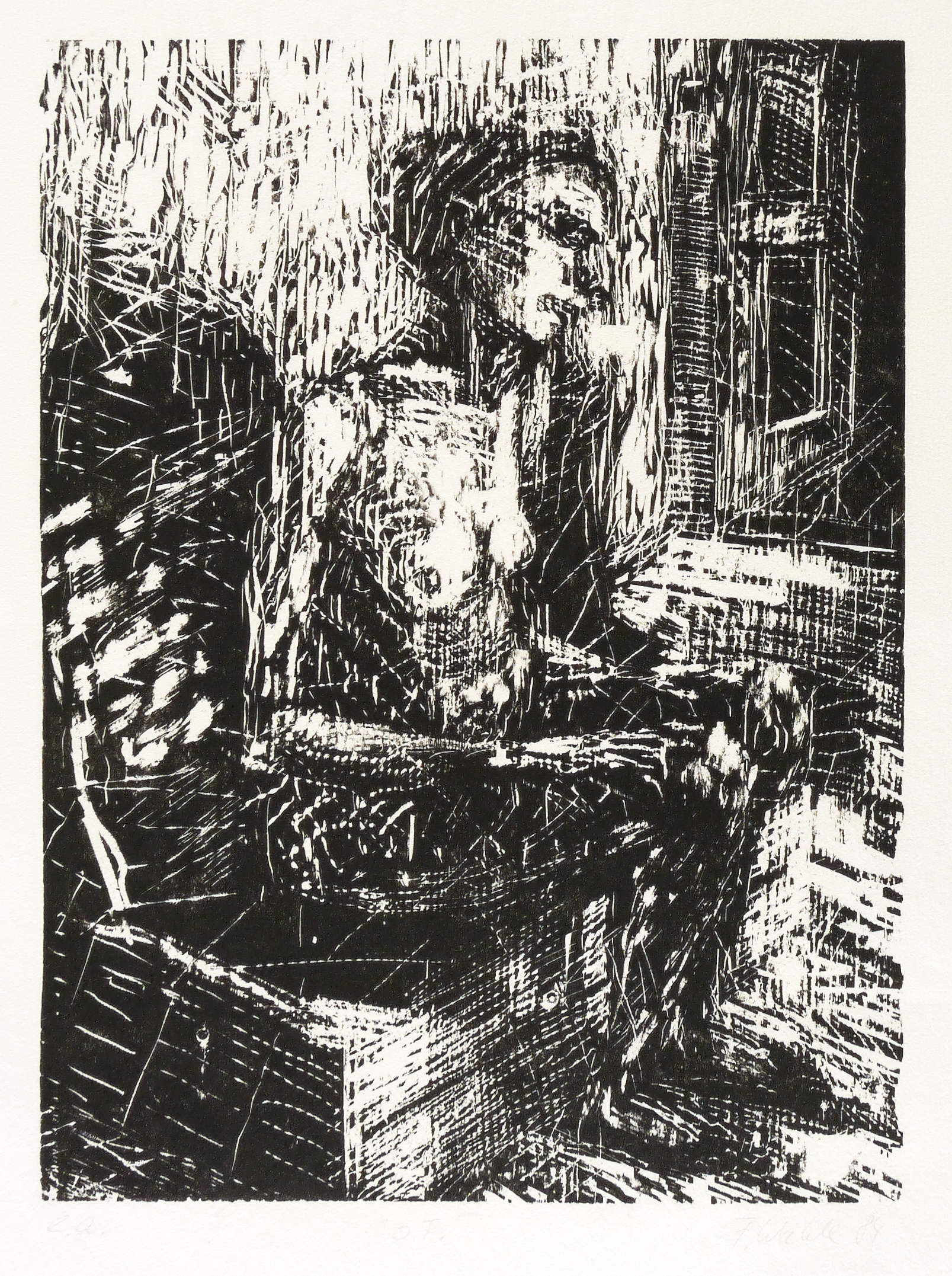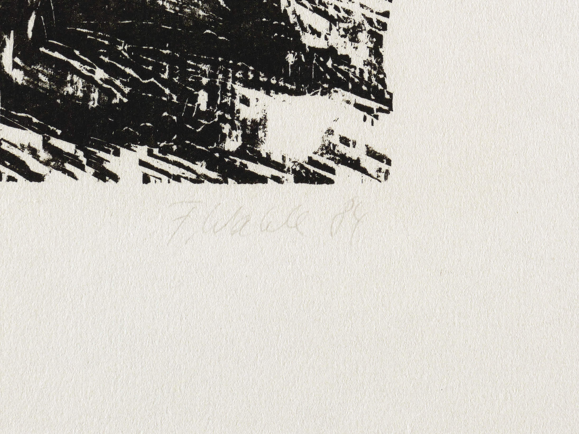 1984. Holzschnitt, in Schwarz, auf rauem hellem Simili-Japan. – Originale Künstlergrafik, von Frank Wahle. – Künstlerexemplar (e.a.). – 31,1 x 23,0 cm (Darstellung / Druckstock), 50 x 40 cm (Blatt).