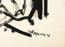 1948. Zeichnung / Pinselzeichnung, in schwarzer Tusche, auf gelbem Velinkarton. – Originale Künstlergrafik, von Erhard Hippold. – Unikat. – 46,0 x 37,5 cm (Darstellung / Blatt).