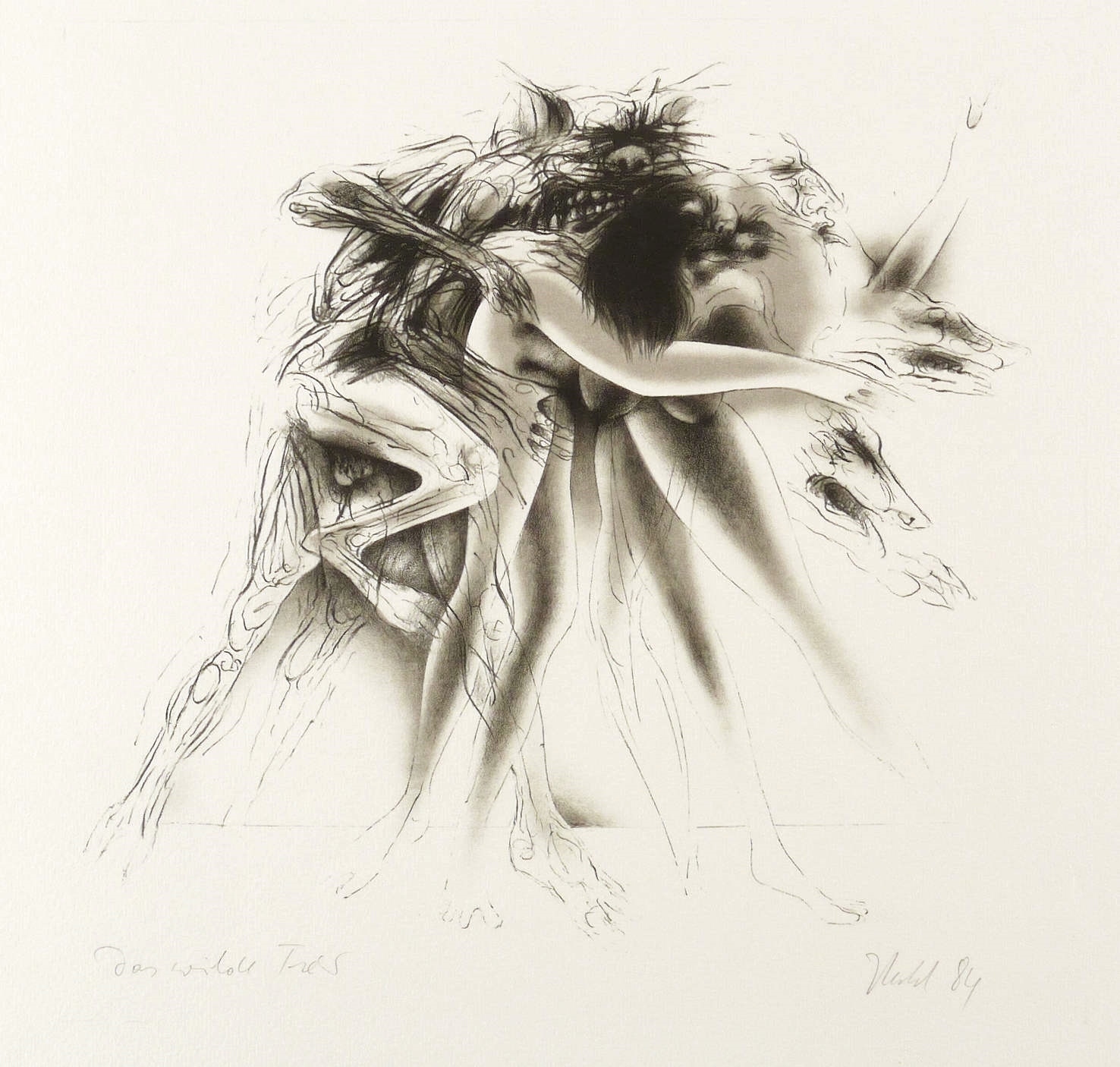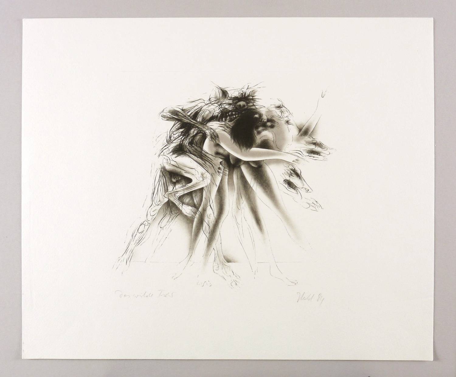 1984. Farblithografie / Pinsel- & Kreidelithografie, in Grau & Schwarz, auf hartem hellgelbem Velin. – Originale Künstlergrafik, von Rainer Herold. – 30,0 x 32,5 cm (Darstellung / Druckbild), 50 x 60 cm (Blatt).