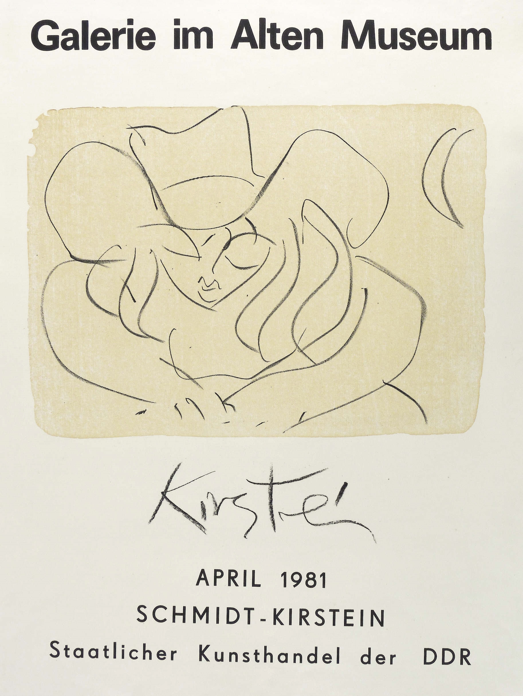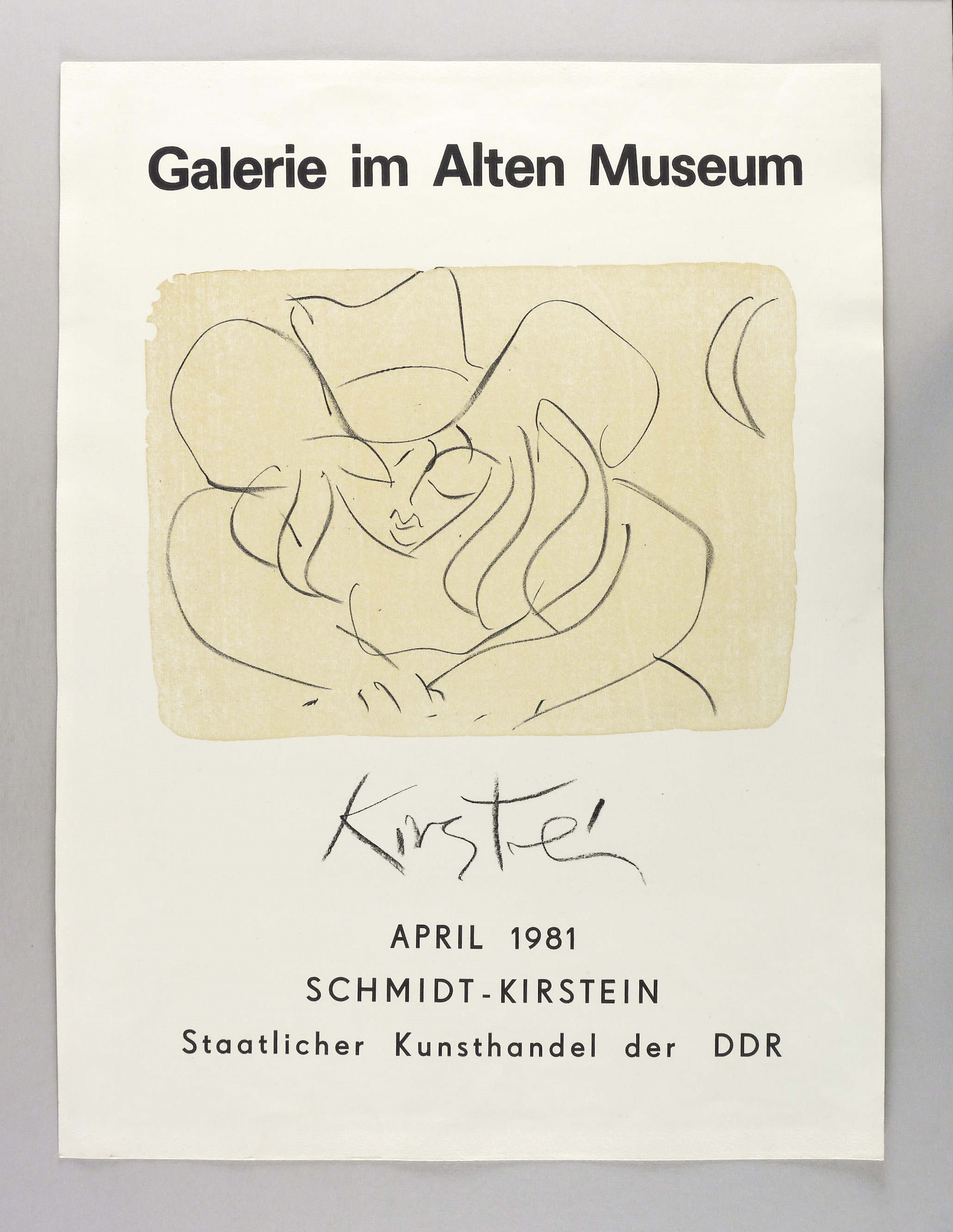 Nicht handsigniert. Im Stein unter der Tonplatte signiert: ″Kirstein″. Typografisch bezeichnet. – Originalgrafisches Plakat zur Ausstellung ″Schmidt-Kirstein″ im April 1981 in der Galerie im Alten Museum Berlin (Staatlicher Kunsthandel der DDR). – Unscheinbare Lagerspuren, im Rand bisweilen leicht griffspurig. Insgesamt guter Zustand.