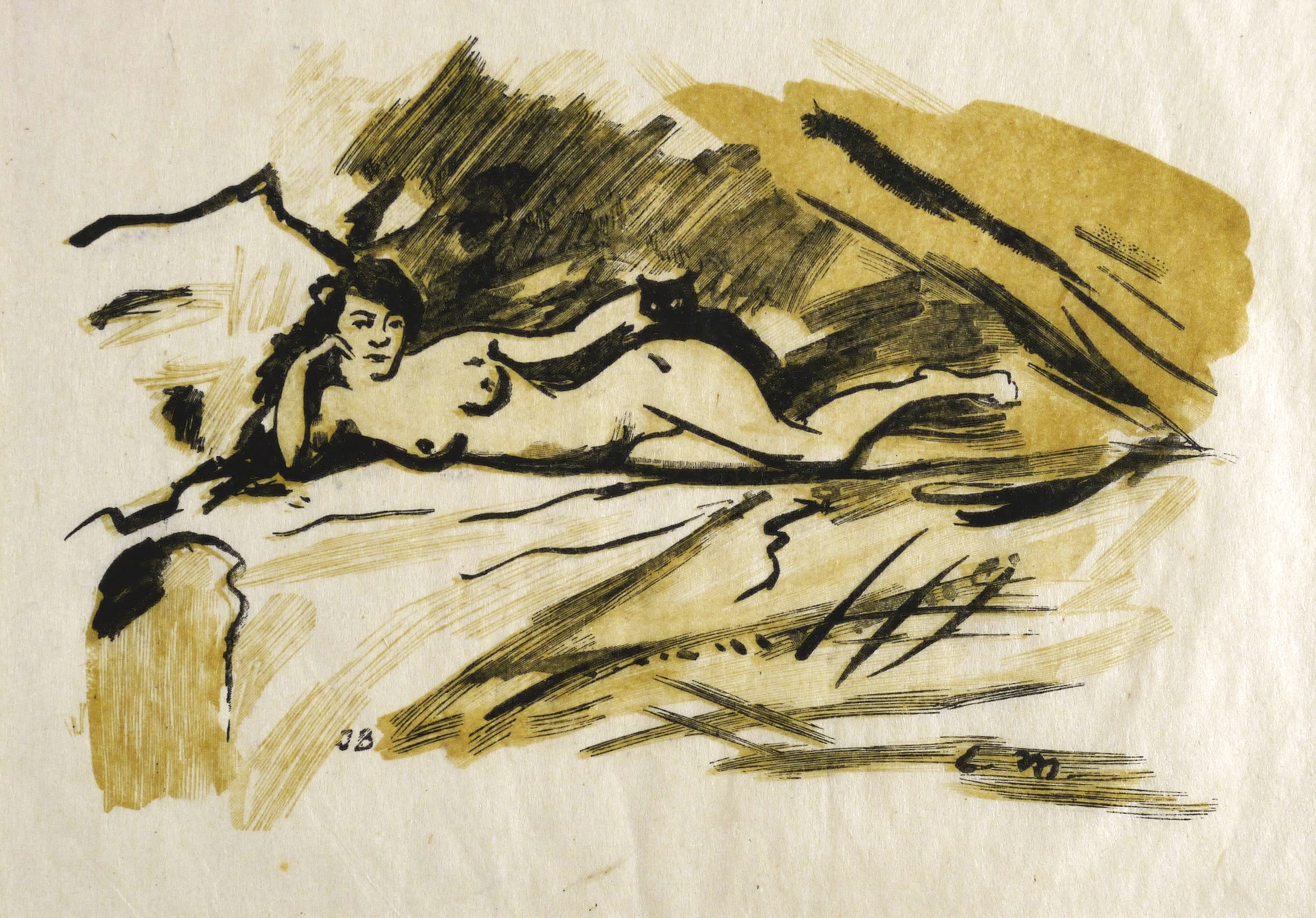 Baillier 287. – Aus: Emil Waldmann, Edouard Manet (Berlin: Paul Cassirer 1923). – Im unteren Blattrand in Bleistift bezeichnet: ″1923 Paul Cassirer Berlin / farbiger original Holzschnitt von Edouard Manet auf die 'Olympia'″. Im Druckstock links unten monogrammiert: ″JB″. Rechts Signatur: ″E.M.″ – Original Holzschnitt von Jacques Beltrand nach der Zeichnung von Edouard Manet für das Frontispiz zu Emil Waldmanns ″Edouard Manet″ (Berlin: Paul Cassirer Verlag 1923). – Guter Zustand. Fachgerecht im Passepartout montiert.