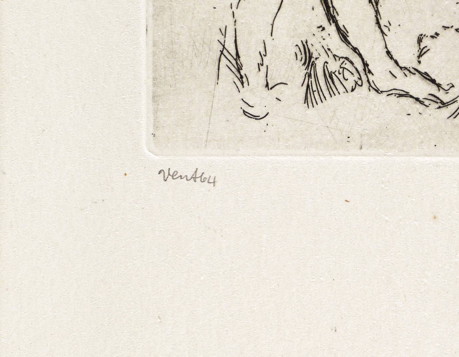 1964. Radierung / Kaltnadel, in Schwarz, auf gelblichem Velin. – Originale Künstlergrafik, von Hans Vent. – 8,9 x 9,6 cm (Darstellung / Platte), 22 x 15 cm (Blatt).