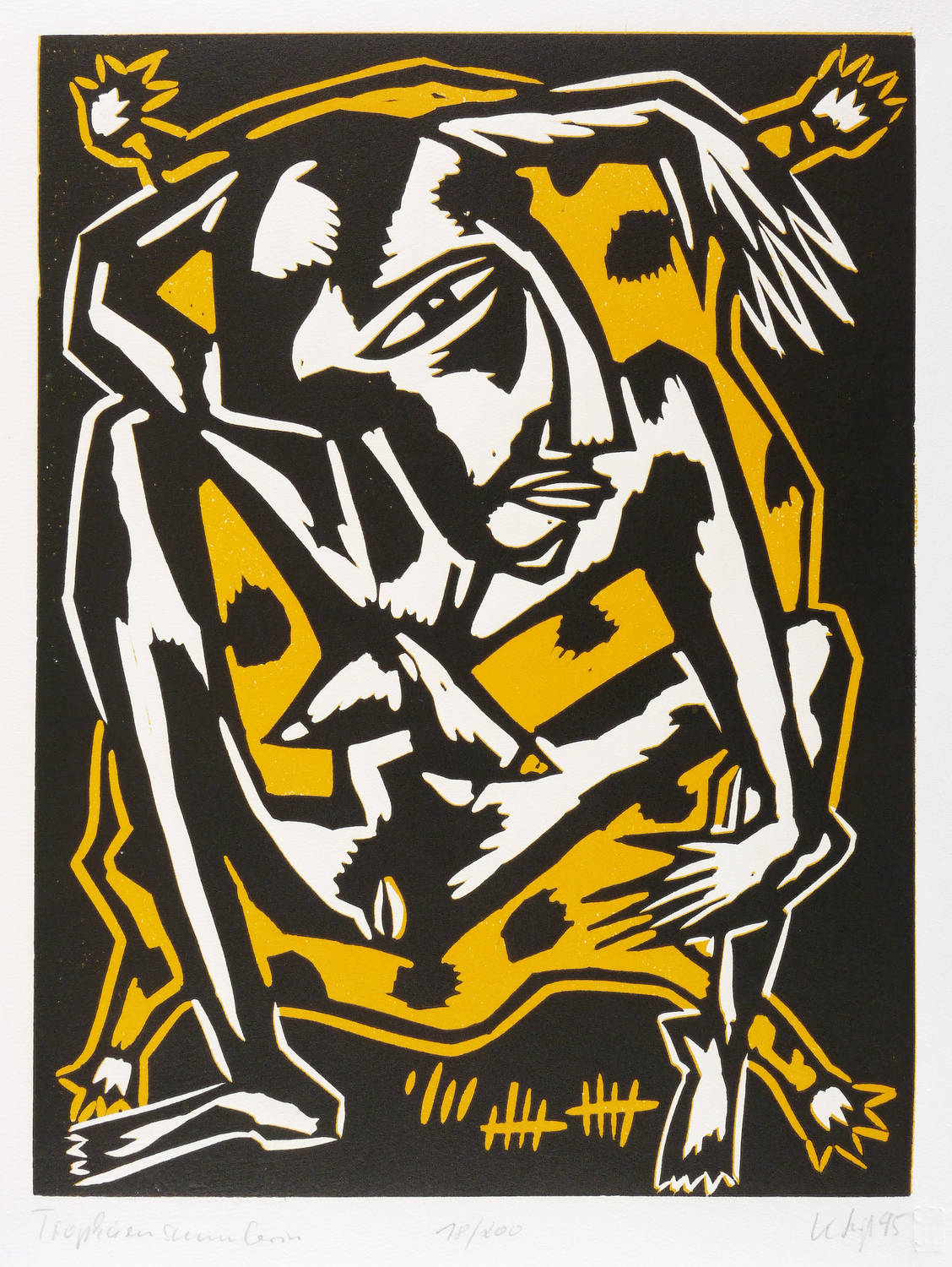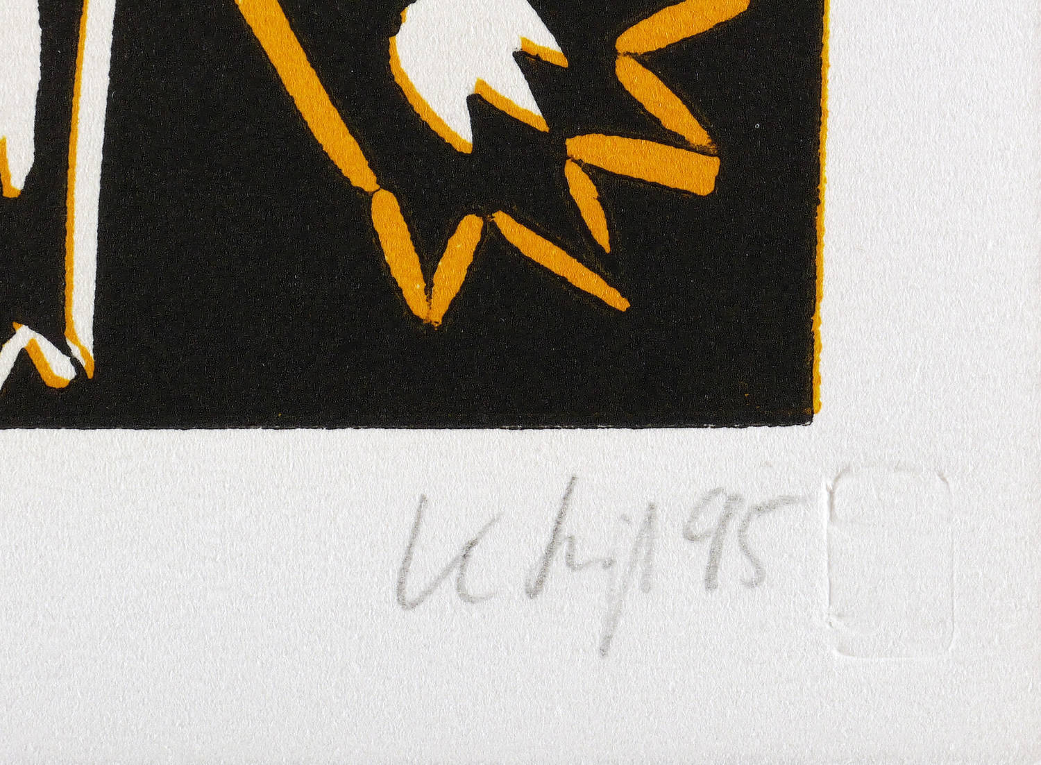 1995. Farbholzschnitt, in Gelb-Orange & Schwarz, auf dickem weißem Velin. – Von Klaus Süß. – Auflage Exemplar Nr. 18/200. – 35,3 x 26,7 cm (Darstellung / Druckstock), 40 x 32 cm (Blatt).