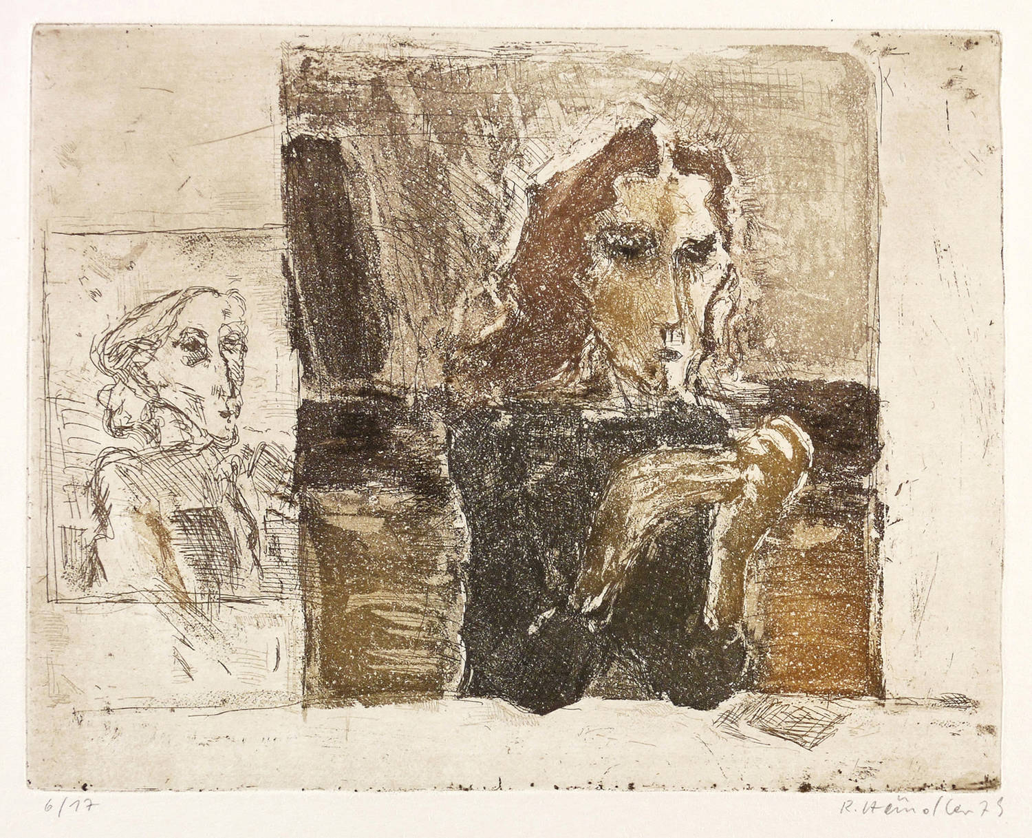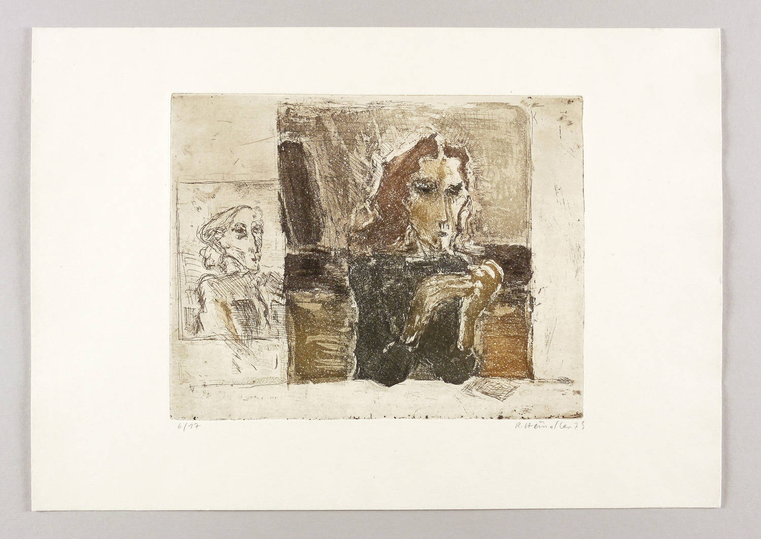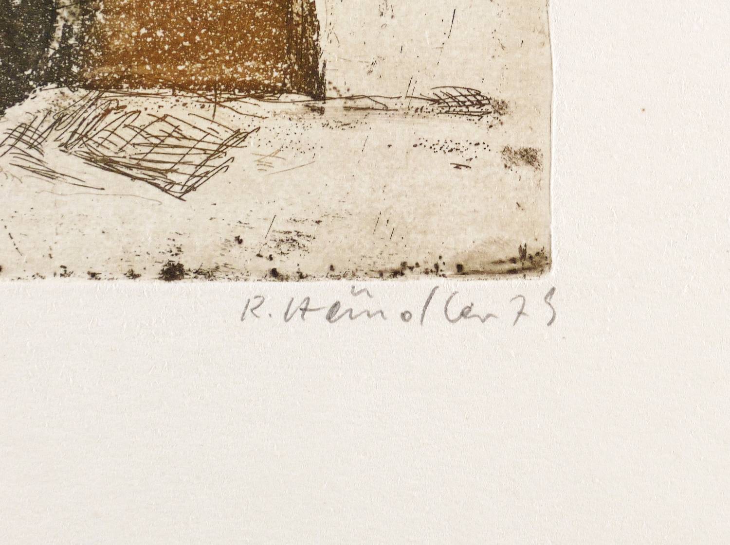1979. Farbradierung / Aquatinta & Strichätzung, in Braun, Grau & Schwarz, auf hellgelbem Velinkarton. – Originale Künstlergrafik, von Rolf Händler. – Auflage Exemplar Nr. 6/17. – 23,6 x 29,9 cm (Darstellung / Platte), 36 x 50 cm (Blatt).
