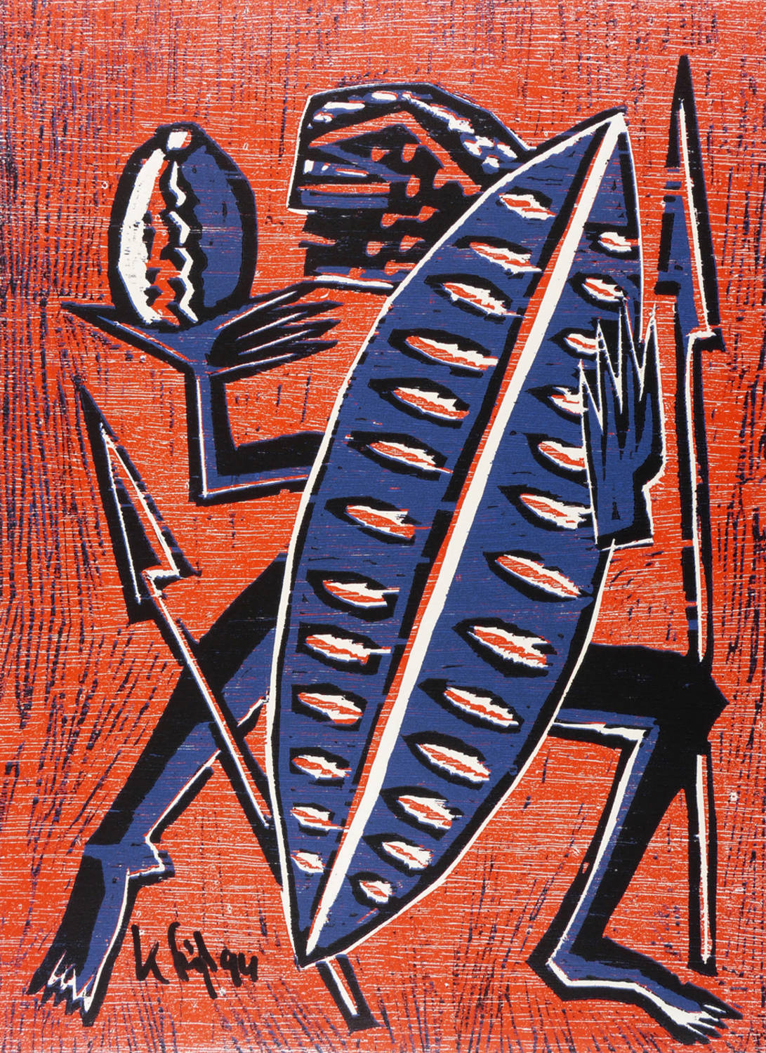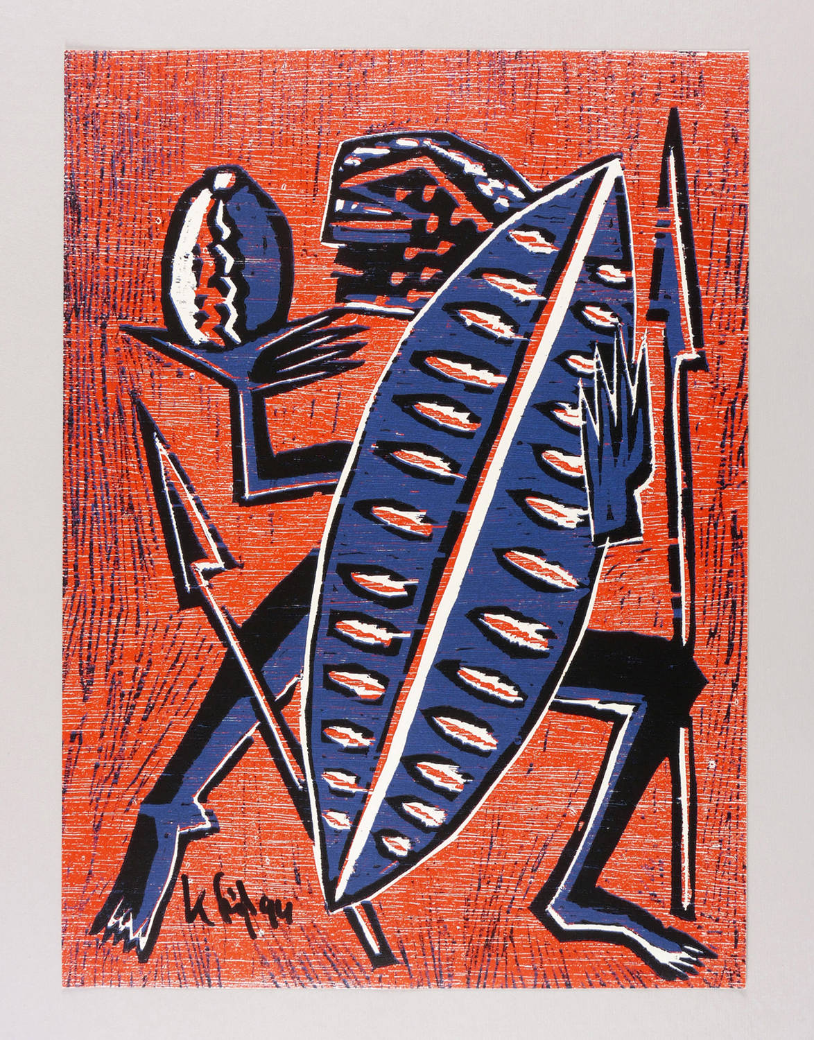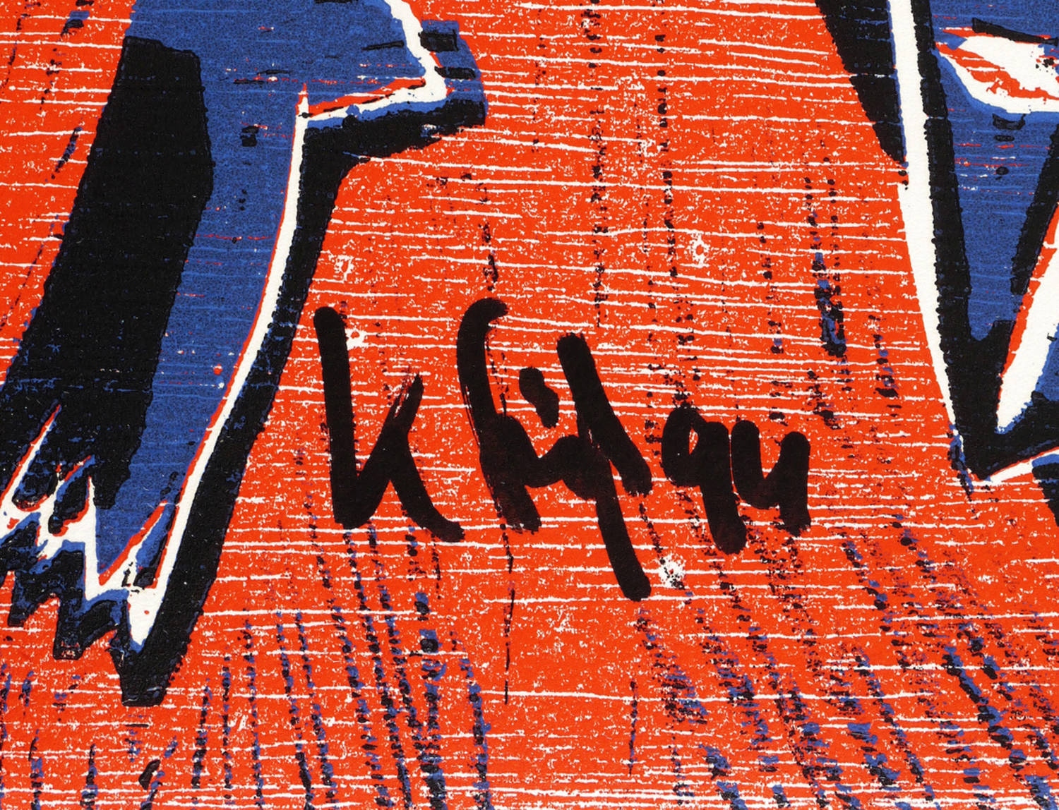 1994. Farbholzschnitt, in Karminrot, Dunkelblau & Schwarz, auf hellchamois Velin. – Von Klaus Süß. – Auflage Exemplar Nr. 22/50. – 49,3 x 36,1 cm (Darstellung / Blatt).