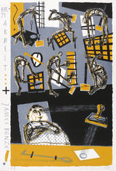 Rechts unten in Bleistift signiert und datiert: ″Volmer 88″. Links Auflagenbezeichnung: ″E.A.″ In der Druckform links Titelinschrift: ″HARTE ARBEIT ... + JAMES BONZE!″ – Tadellos. Sehr guter Zustand.