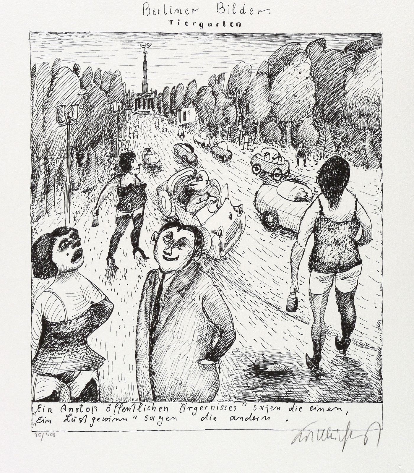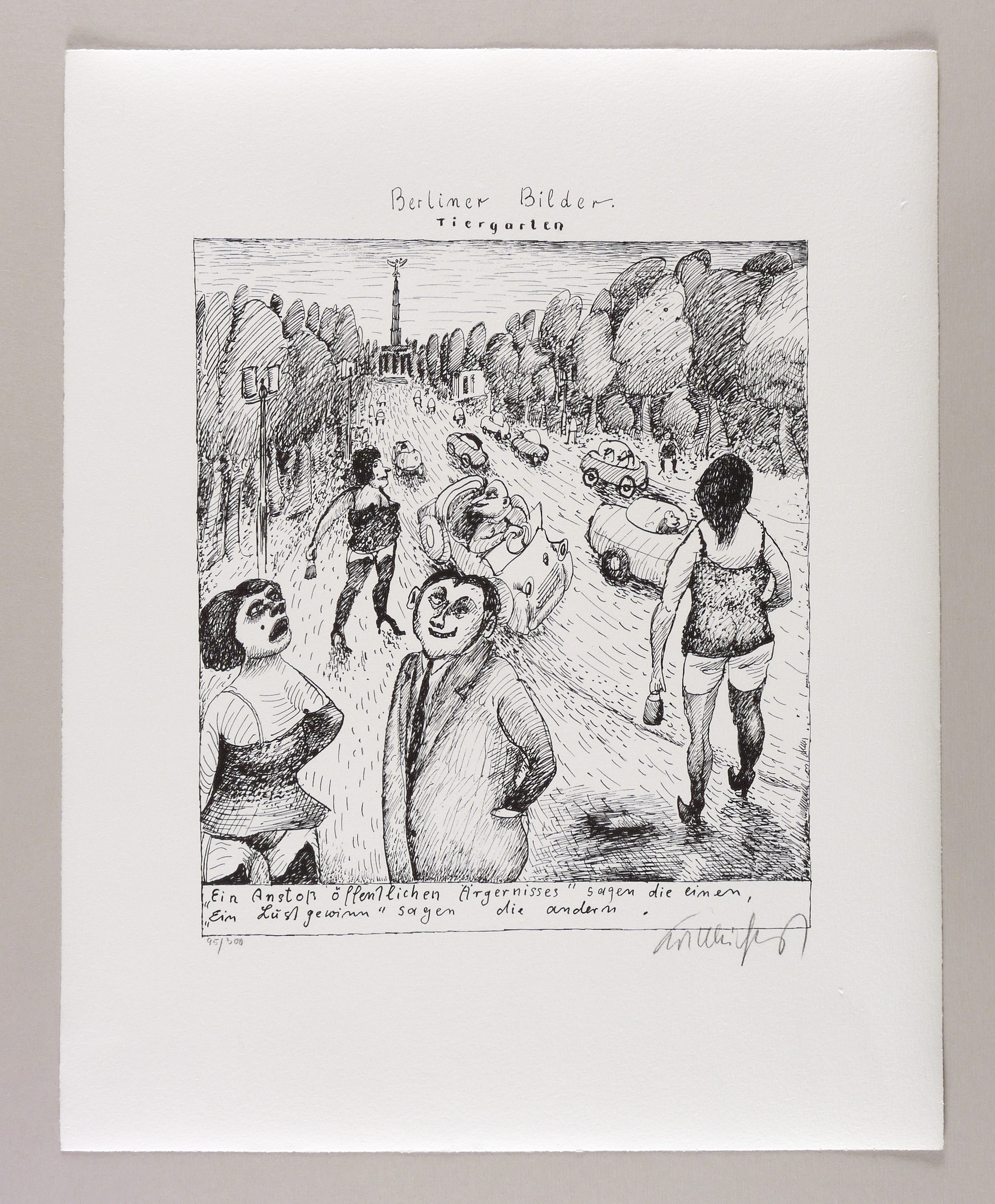 Rechts unten in Bleistift signiert: ″Curt Mühlenhaupt″. Links Auflagenbezeichnung. Oben Inschrift: ″Berliner Bilder / TIergarten″. Unten weiter: ″'Ein Anstoß öffentlichen Ärgernisses' sagen die einen, 'Ein Lustgewinn' sagen die anderen.″ – Ohne Mängel. Sehr guter Zustand.