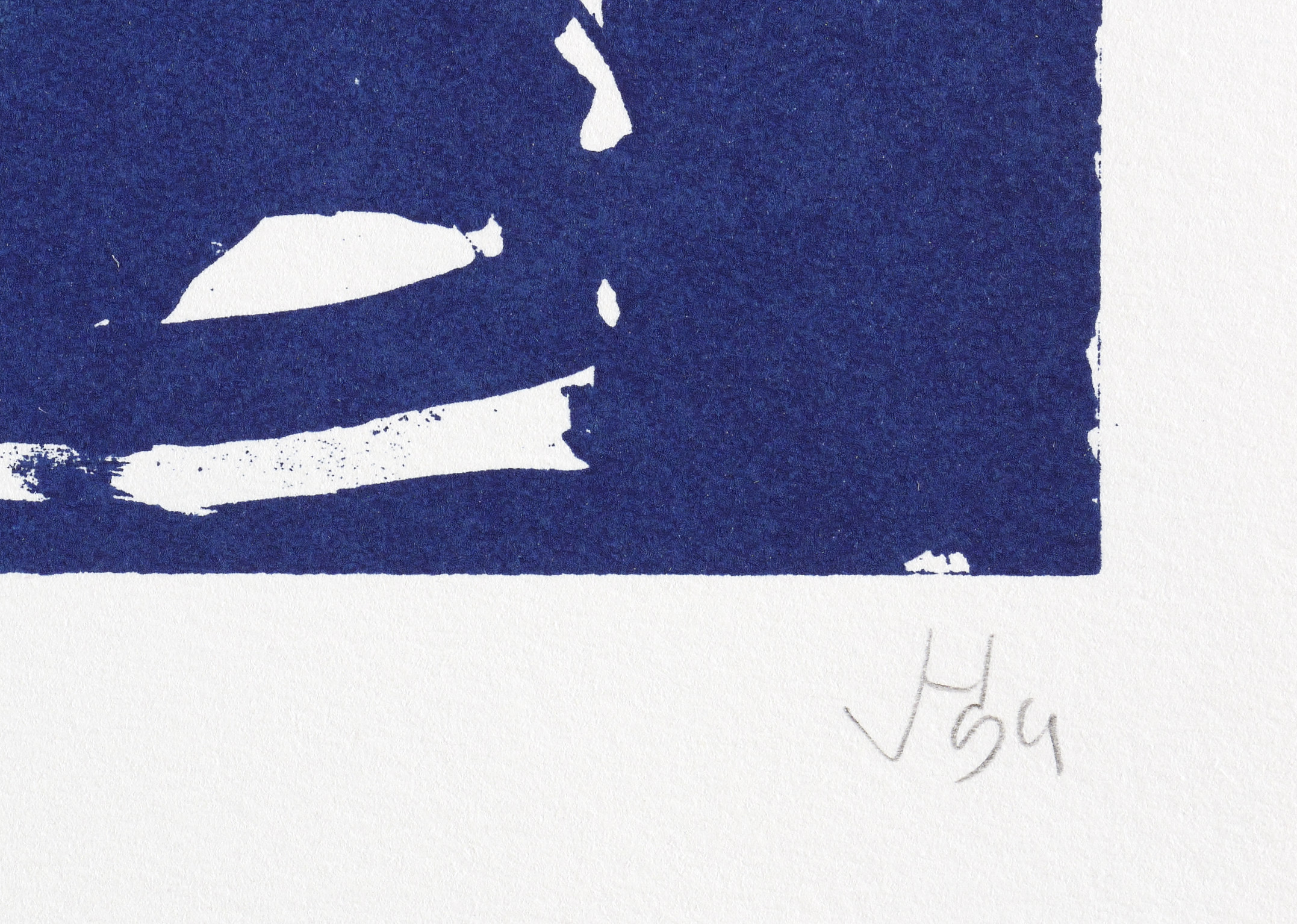 1994. Farbsiebdruck / Farbserigrafie, partiell geschabt, in Hell- & Dunkelblauauf feinem Velinkarton. – Originale Künstlergrafik, von Veit Hofmann. – Auflage Exemplar Nr. 31/200. – 32,7 x 37,1 cm (Darstellung / Druckbild), 51 x 43 cm (Blatt).