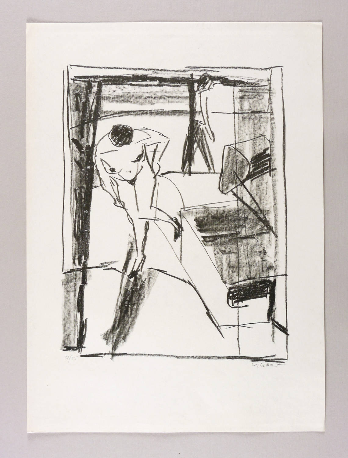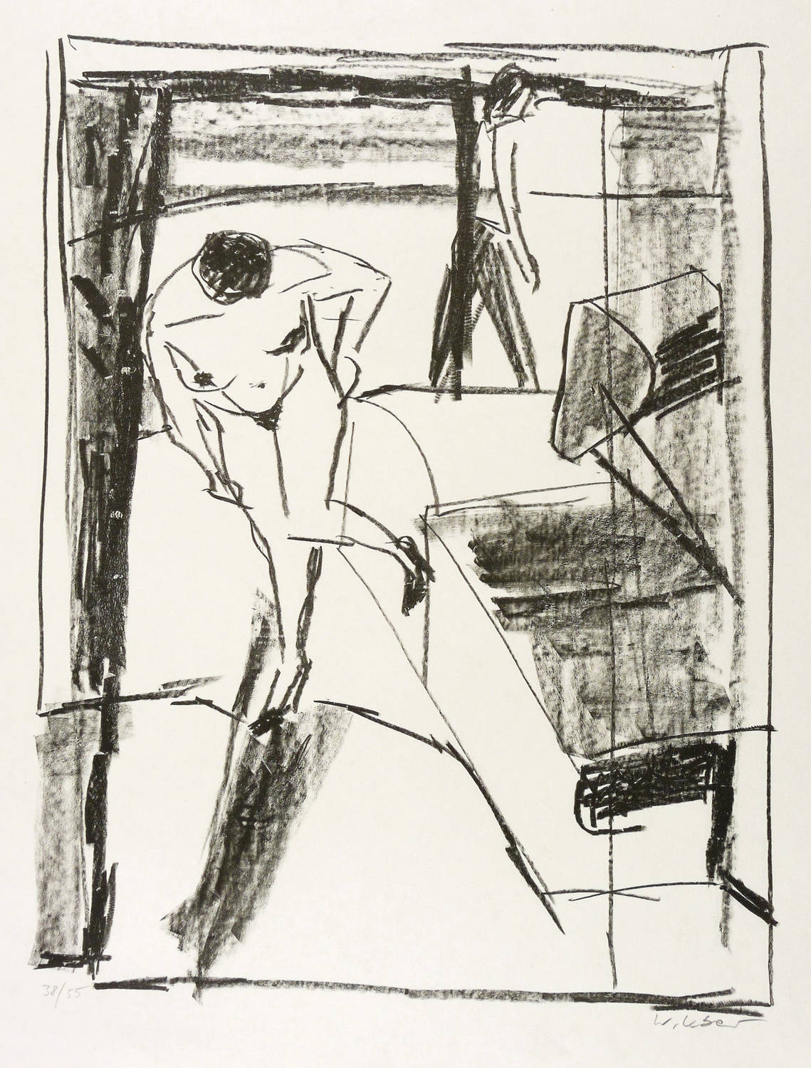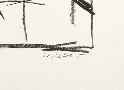 1980-1990. Lithografie / Kreidelithografie, in Schwarz, auf glattem hellchamois Velin. – Originale Künstlergrafik, von Wolfgang Leber. – Auflage Exemplar Nr. 38/55. – 35,5 x 27,3 cm (Darstellung / Druckbild), 49 x 36 cm (Blatt).