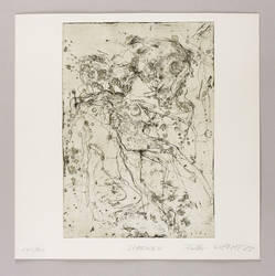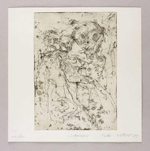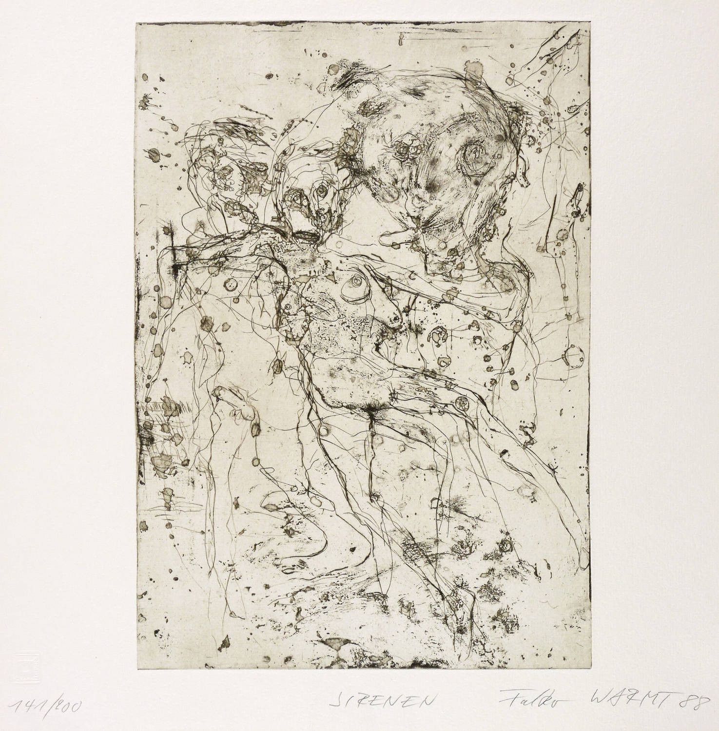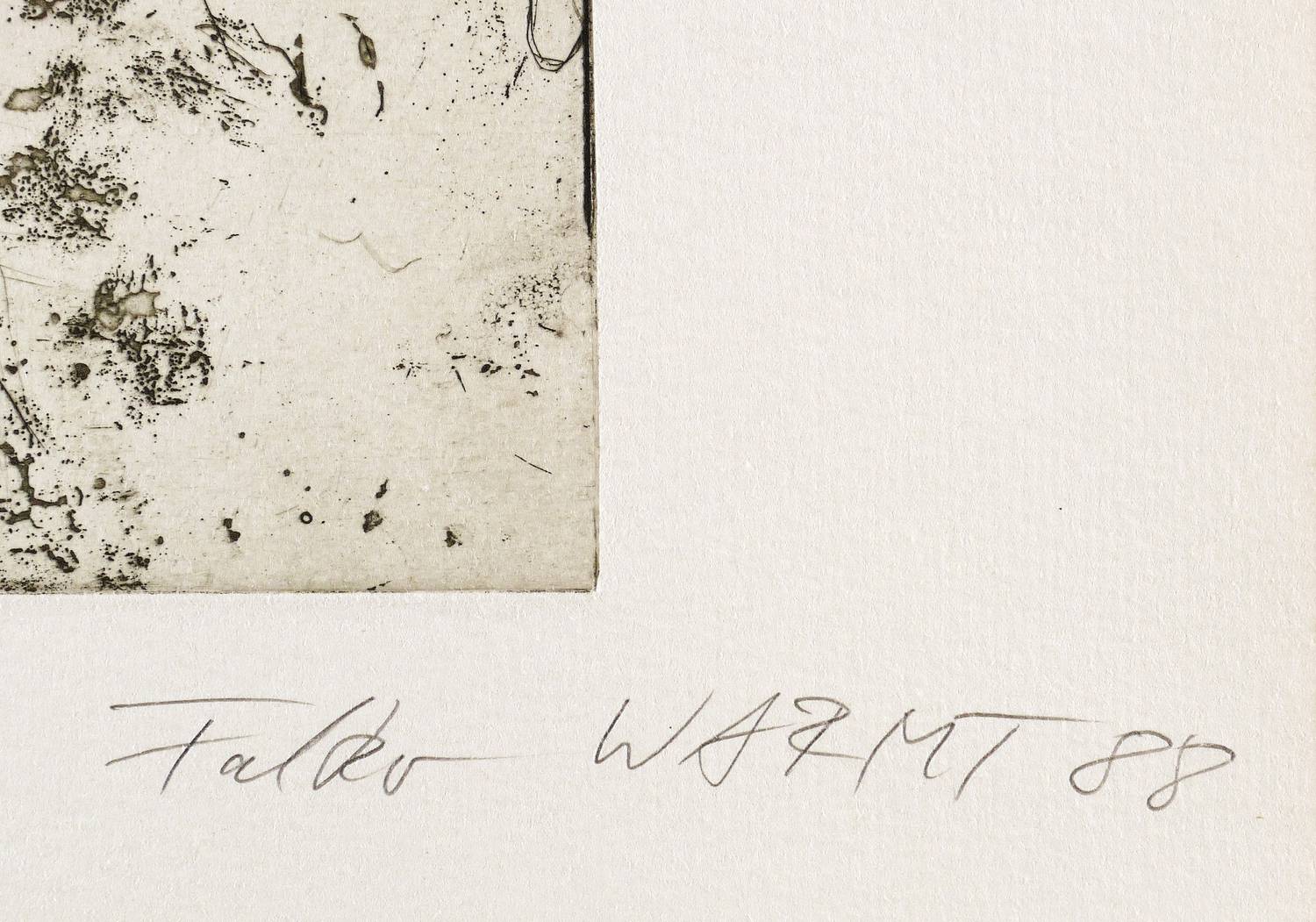 1988. Radierung / Strichätzung & Reservage, in Schwarz, auf hartem hellchamois Velin. – Originale Künstlergrafik, von Falko Warmt. – Auflage Exemplar Nr. 141/200. – 31,6 x 22,0 cm (Darstellung / Platte), 36 x 36 cm (Blatt).